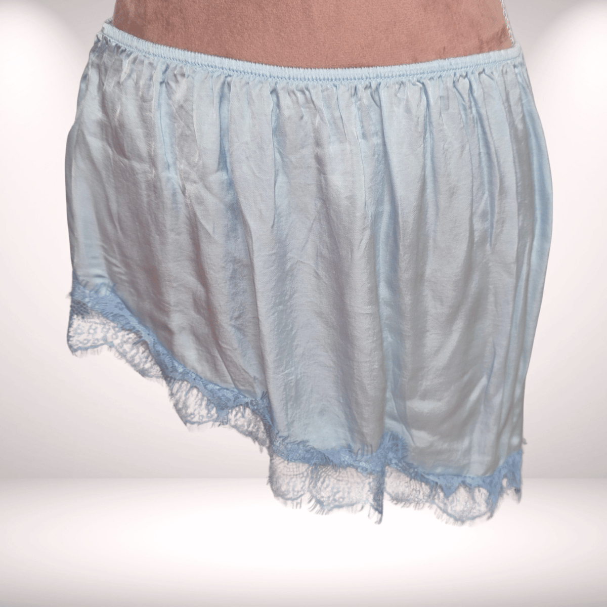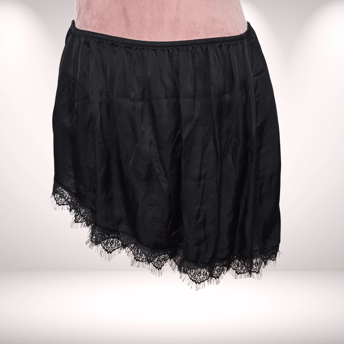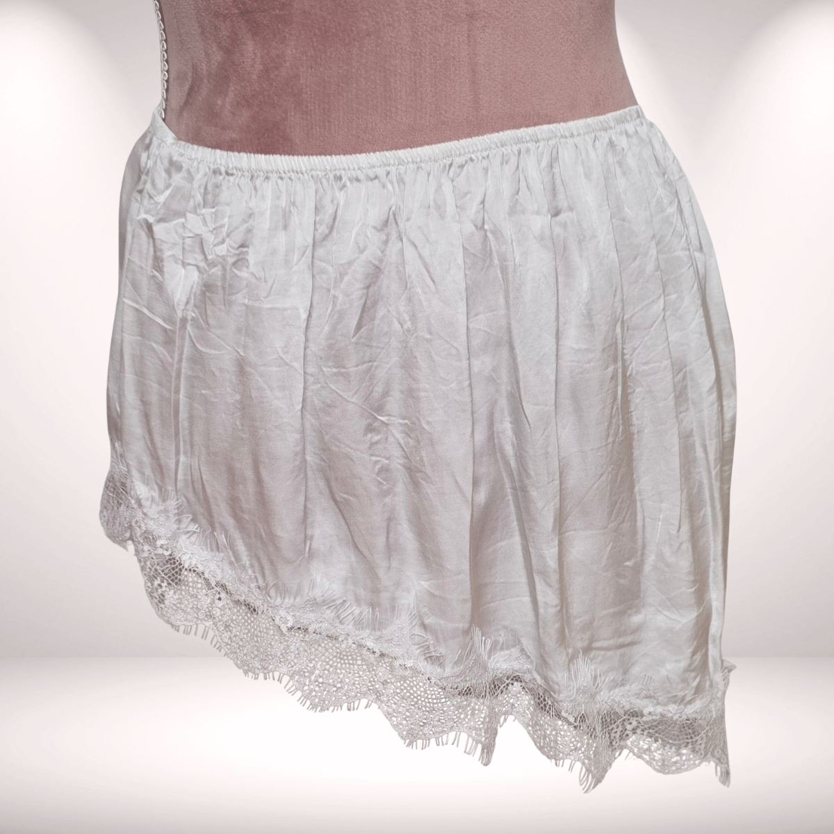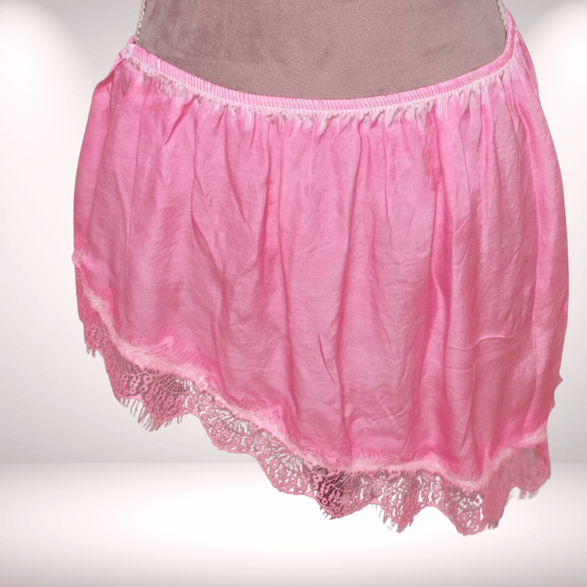 Der elastische Gummibund sorgt für einen bequemen Sitz und hohen Tragekomfort, während das leichte, fließende Material sanft die Haut umspielt. Ein besonderes Highlight ist der untere Saum mit feiner Spitze, der dem Design eine verspielte und stilvolle Ausstrahlung verleiht.