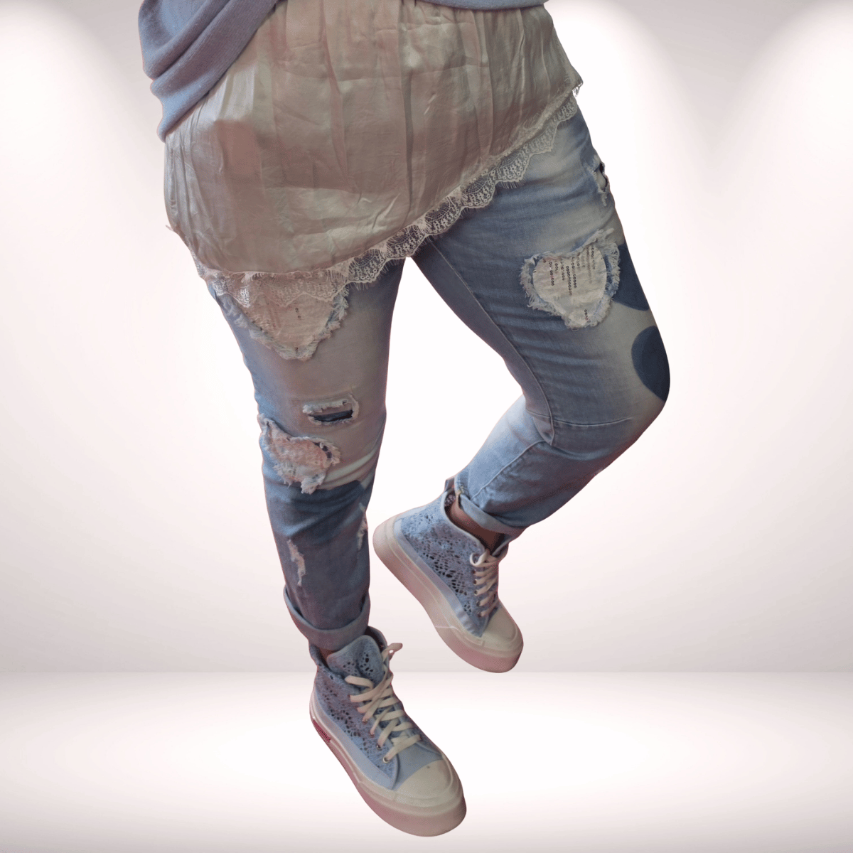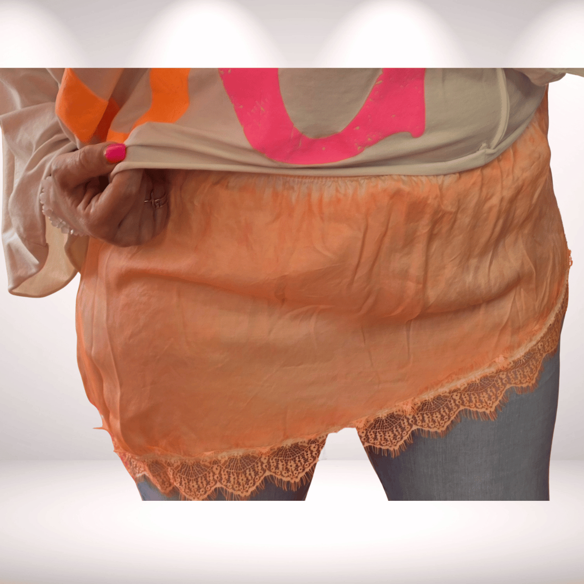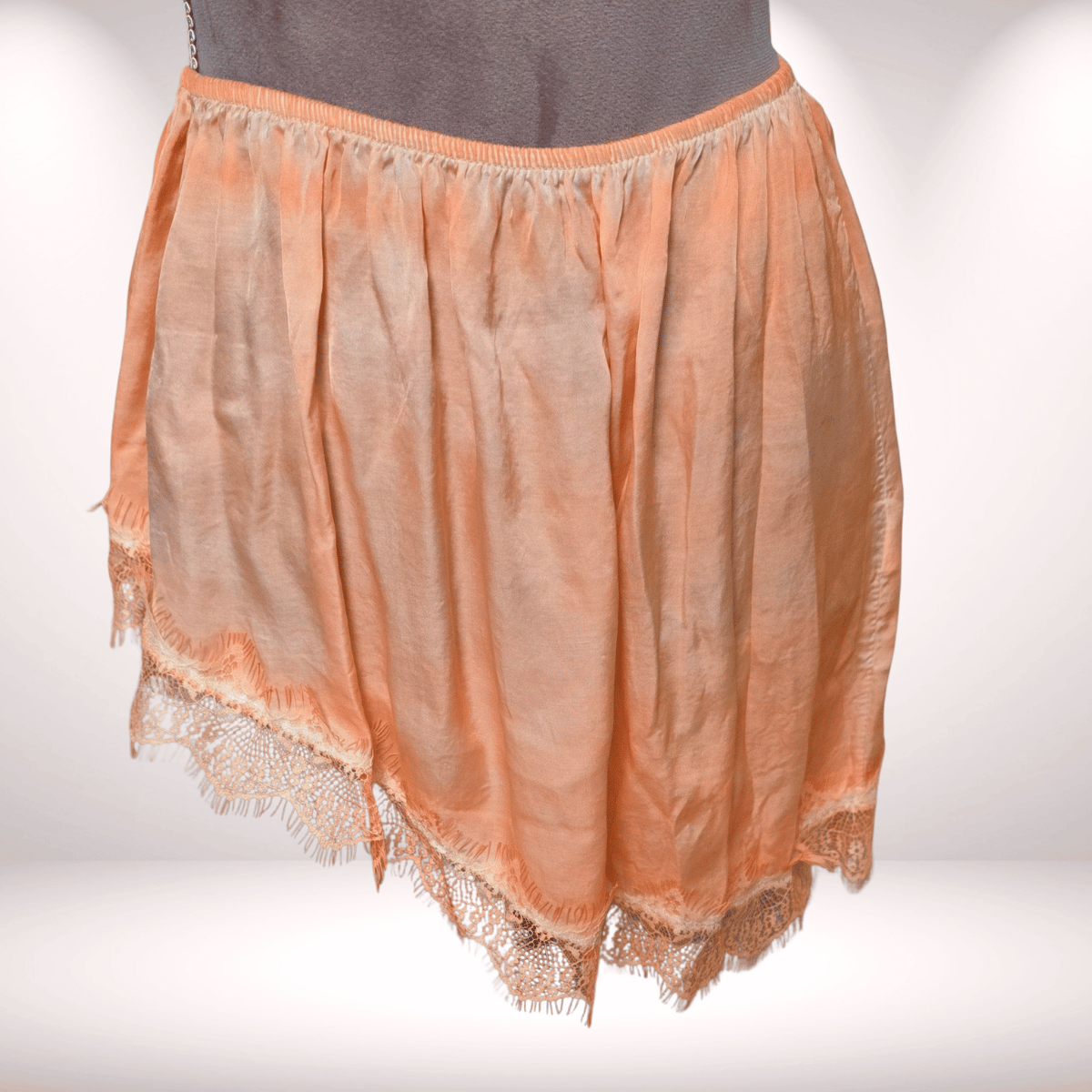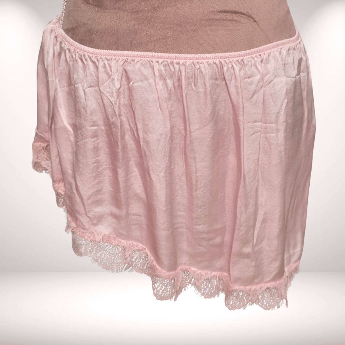 Der elastische Gummibund sorgt für einen bequemen Sitz und hohen Tragekomfort, während das leichte, fließende Material sanft die Haut umspielt. Ein besonderes Highlight ist der untere Saum mit feiner Spitze, der dem Design eine verspielte und stilvolle Ausstrahlung verleiht.