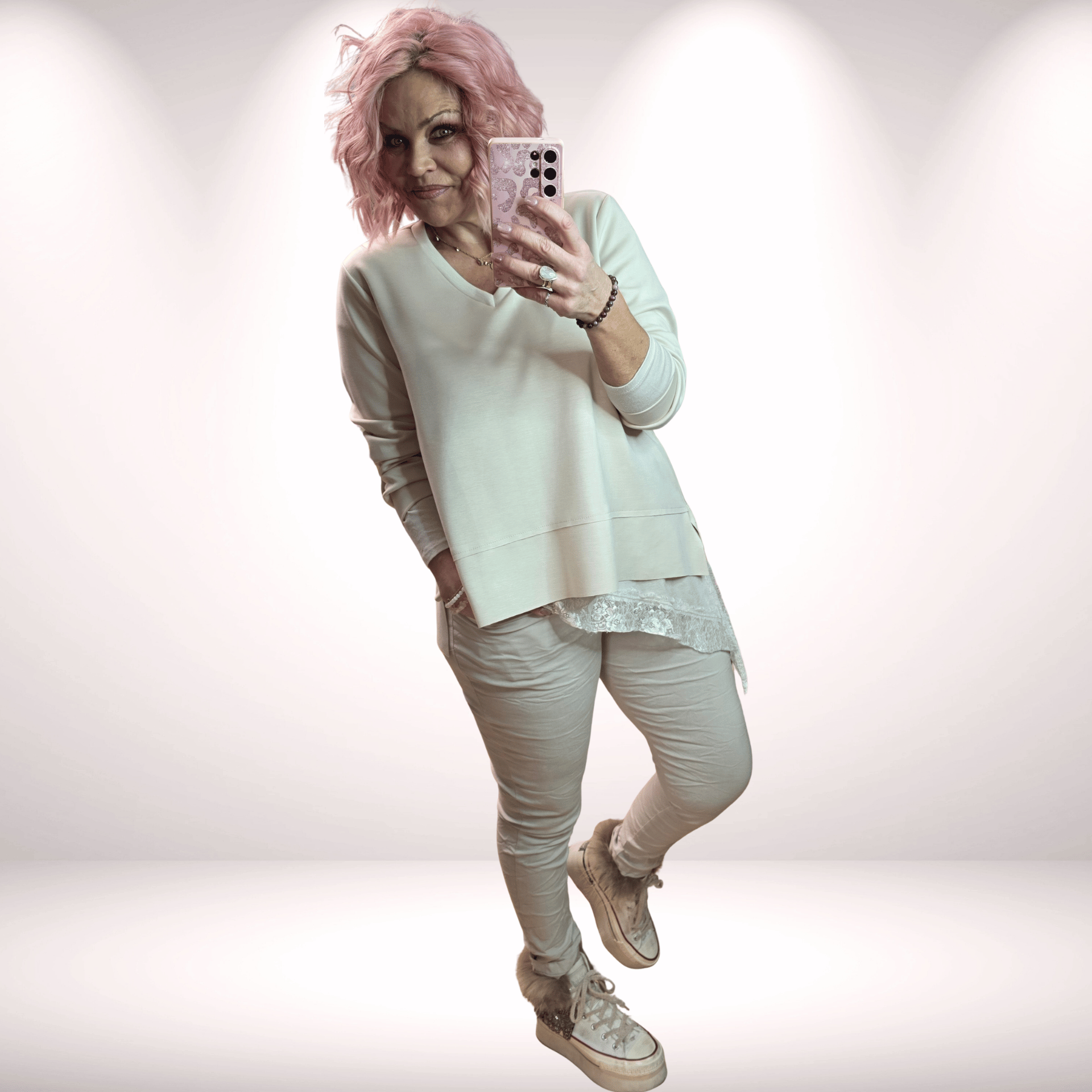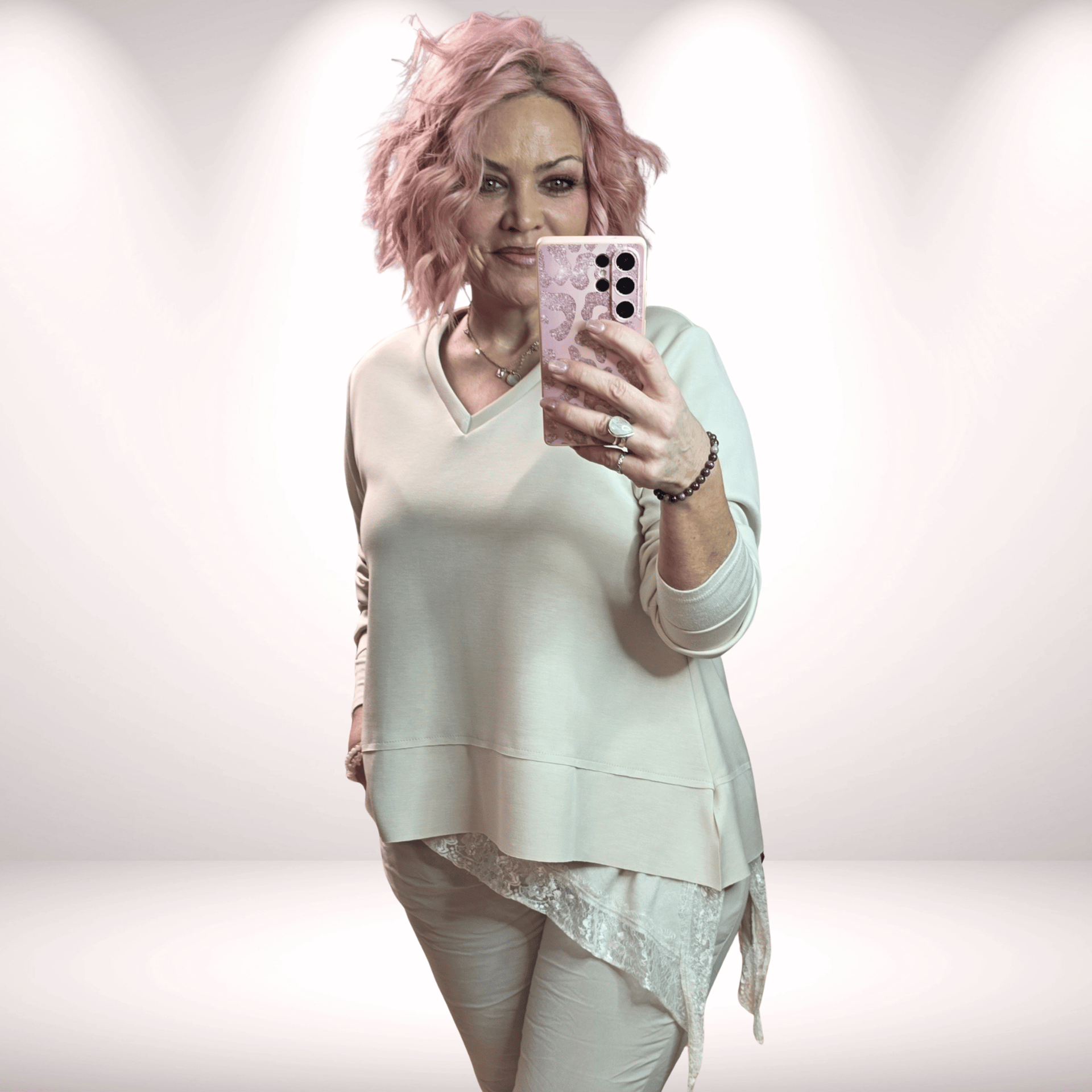 Dieses asymmetrische Shirt in Beige ist ein echtes Highlight für stilvolle Looks. Der feminine V-Ausschnitt und die zarte Spitze am Bundabschluss verleihen dem Shirt eine elegante Note, während der fließende Schnitt für einen modernen, lässigen Fall sorgt. Dank der dehnbaren Qualität trägt es sich angenehm und passt sich deiner Figur perfekt an. ✨