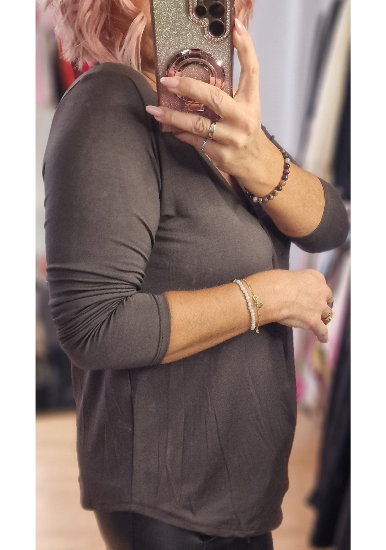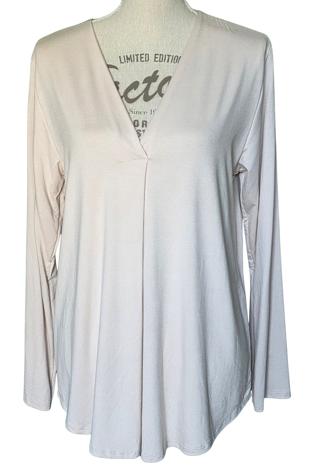 Ein zeitloses Basic Shirt mit femininer A-Form und klassischem V-Ausschnitt. Der dehnbare Stoff sorgt für hohen Tragekomfort, während der lässige Schnitt deine Figur schmeichelhaft umspielt. In den Farben Schoko und Beige ein vielseitiger Allrounder für deinen Kleiderschrank.