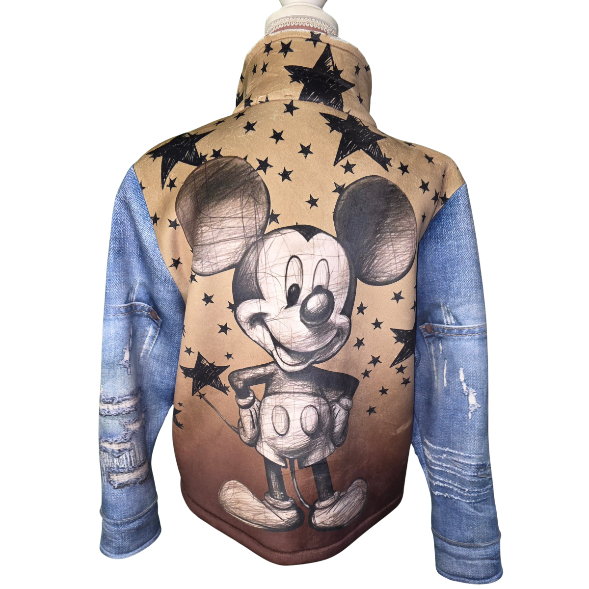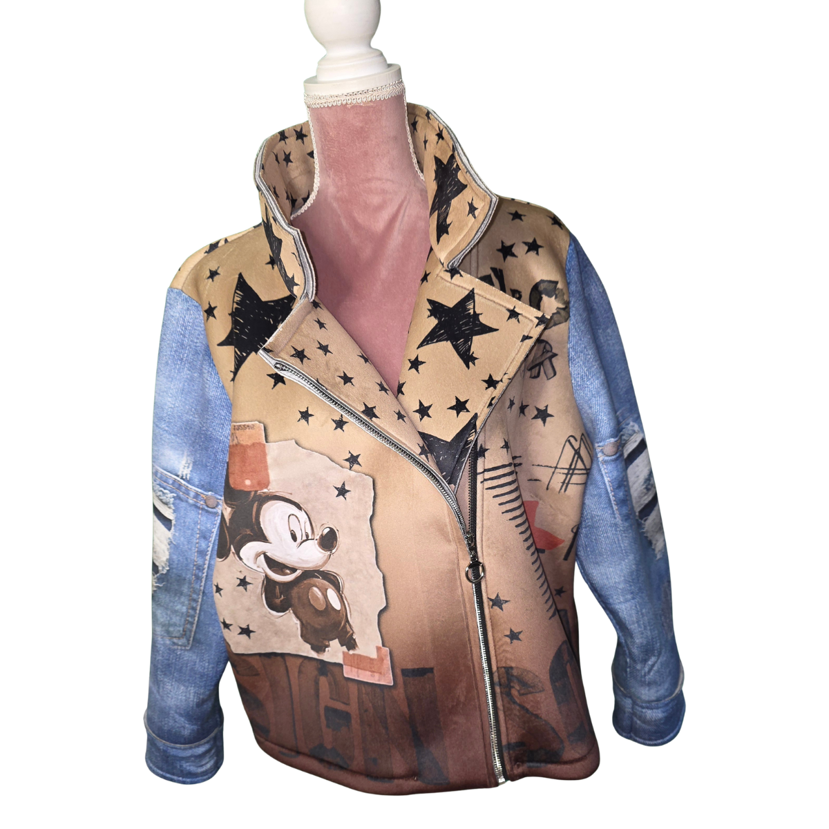 Die Biker Jacke „Mega Print“ kombiniert coole Jeans-Optik mit warmen Braun-Tönen und einem stylischen Reißverschluss. Besonders die aufwendig gestaltete Rückenansicht mit Maus-Print macht diese Jacke zu einem echten Eyecatcher!
