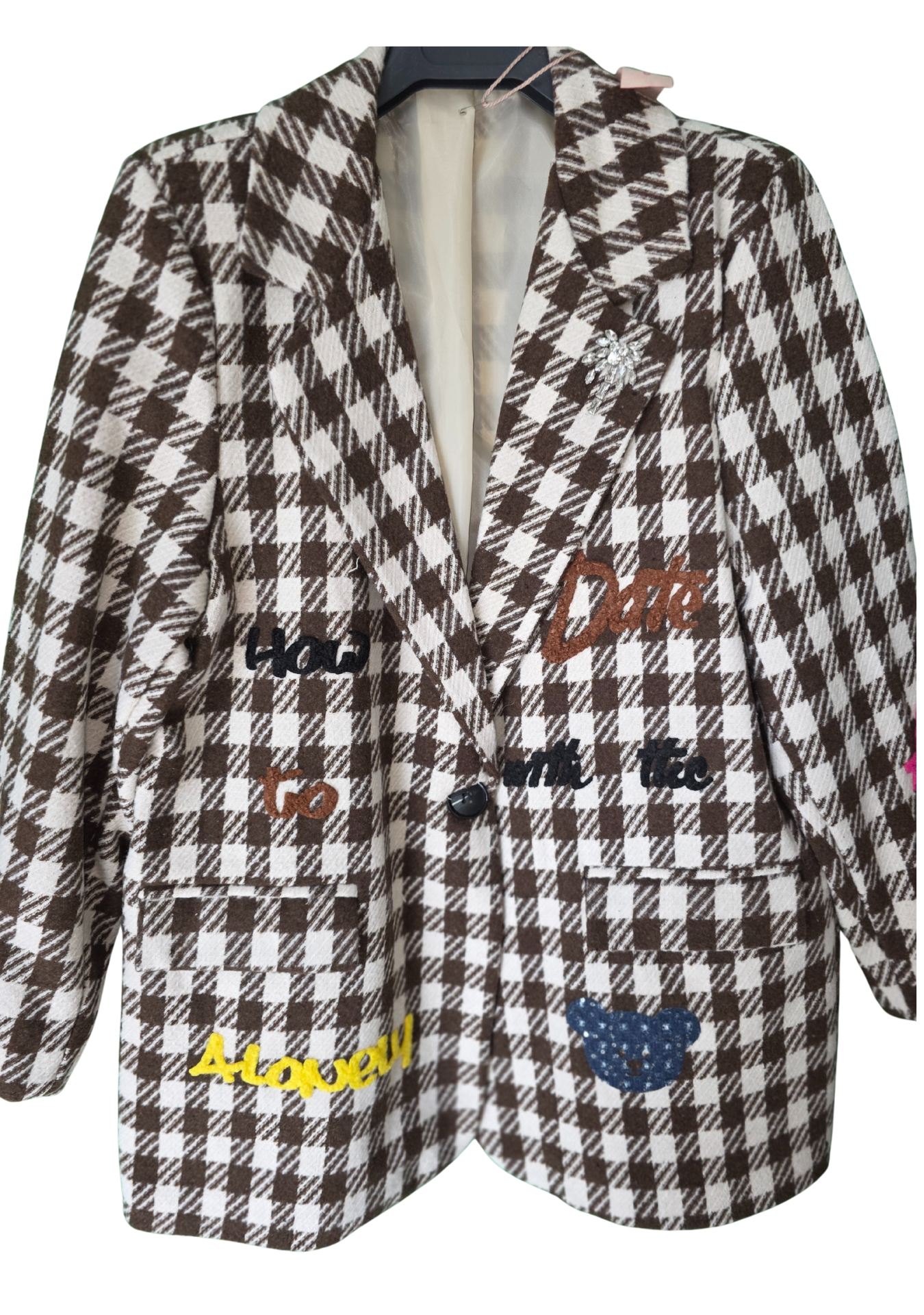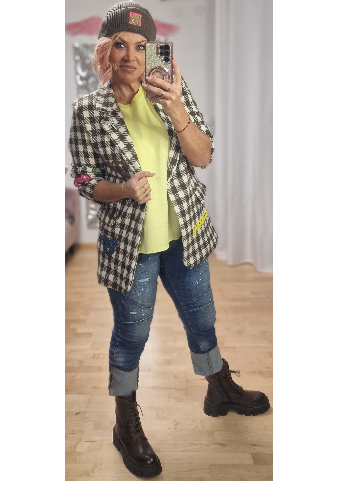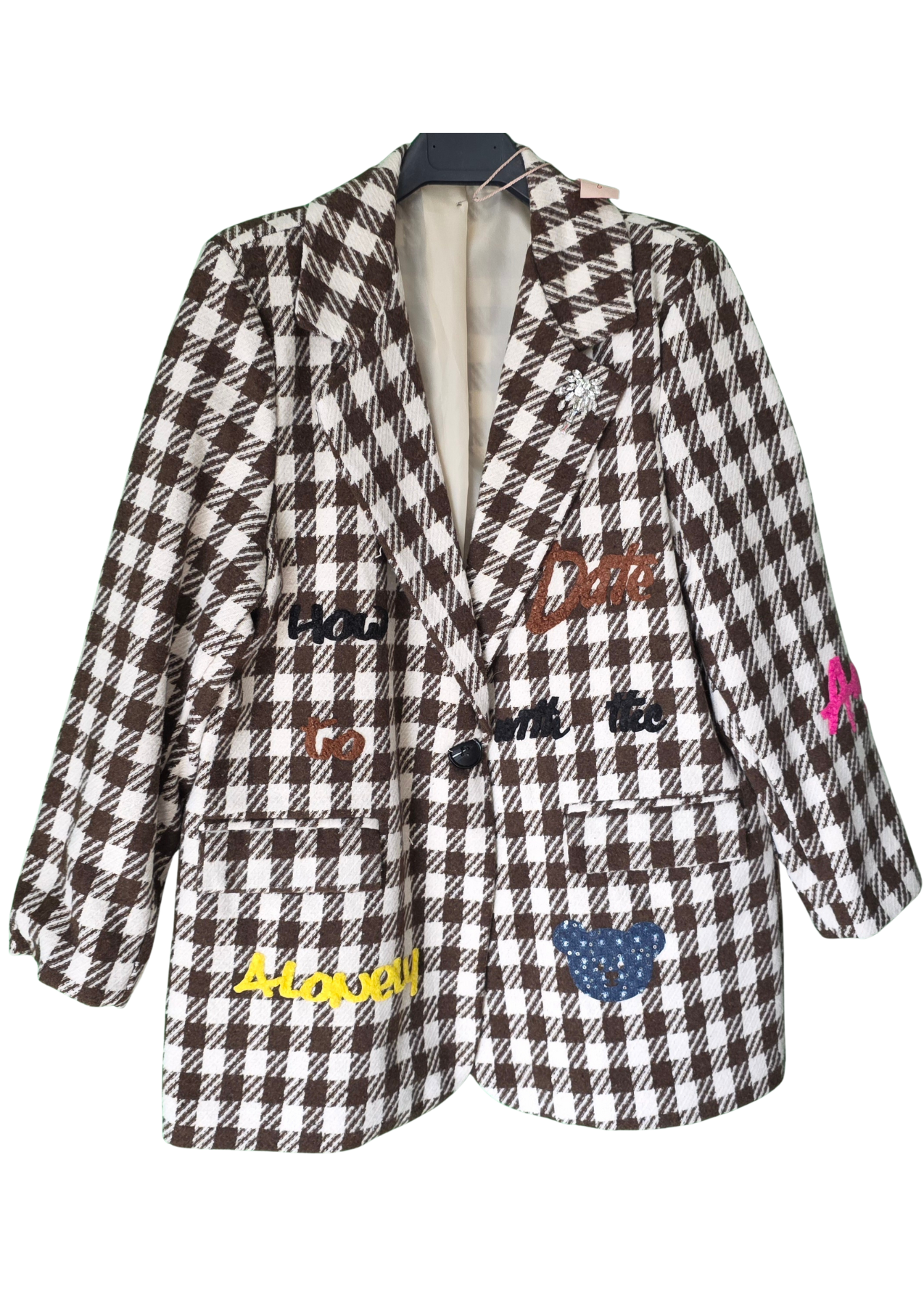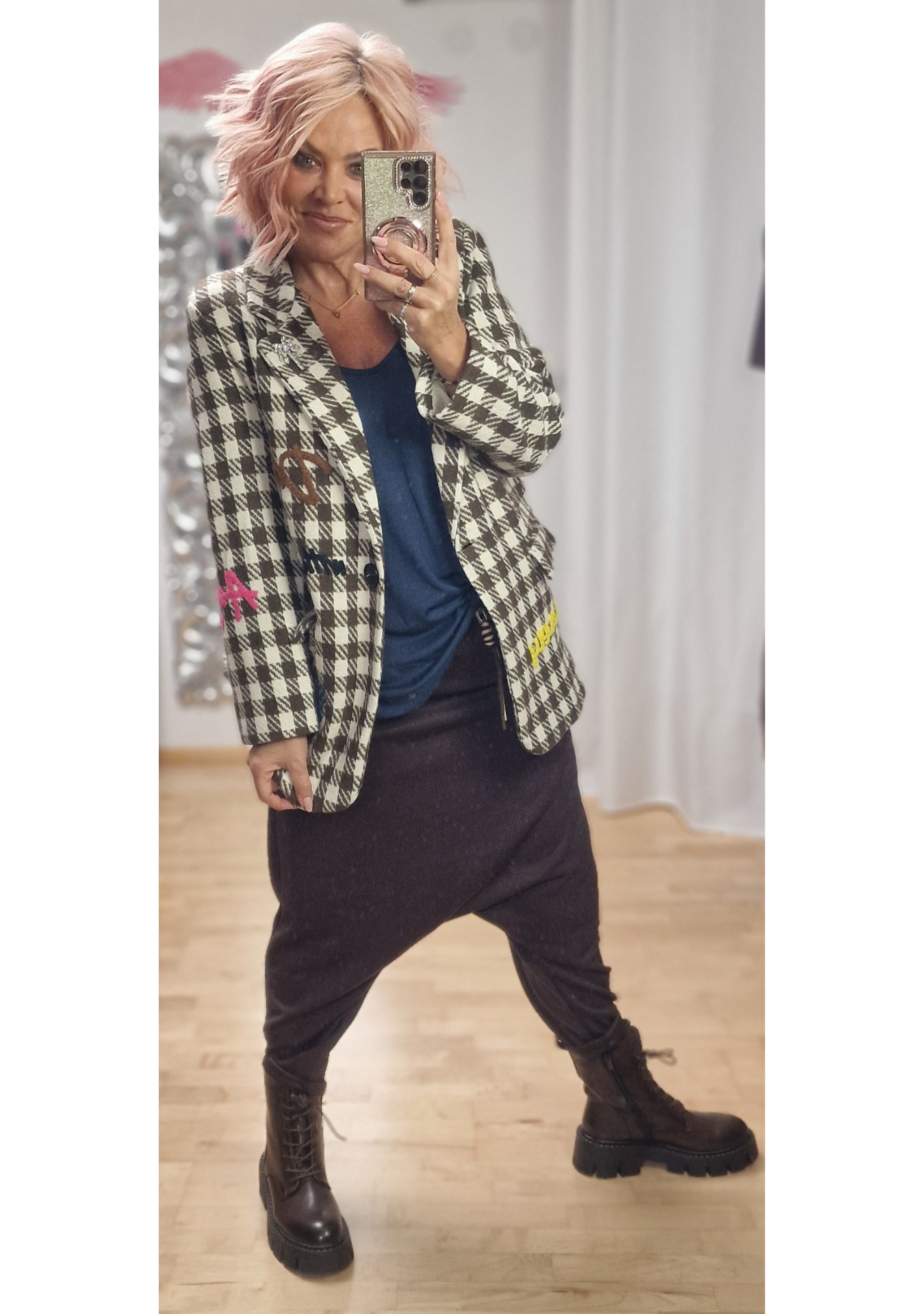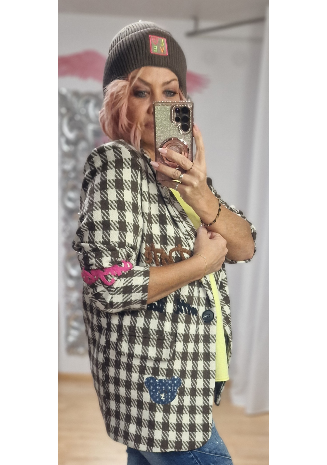 Blazer Schoko-Offwhite Kariert – Limited EditionDieser karierte Blazer ist ein echtes Fashion-Highlight! In der Trend-Kombi Schoko & Offwhite überzeugt er durch seinen edlen Look und ist dank Stickereien und Patches ein einzigartiges It-Piece.