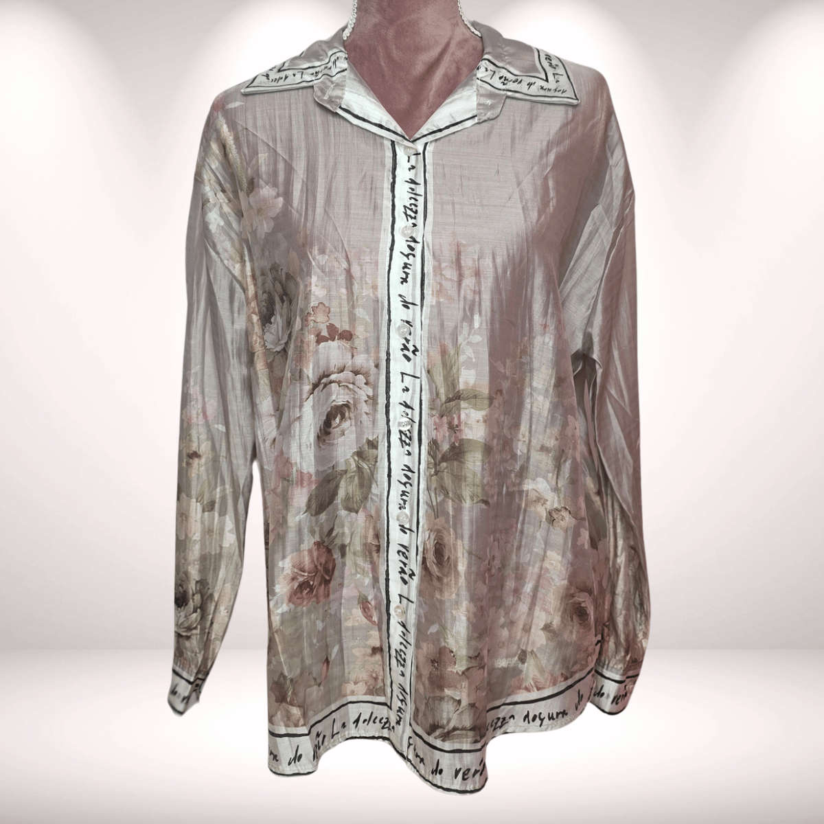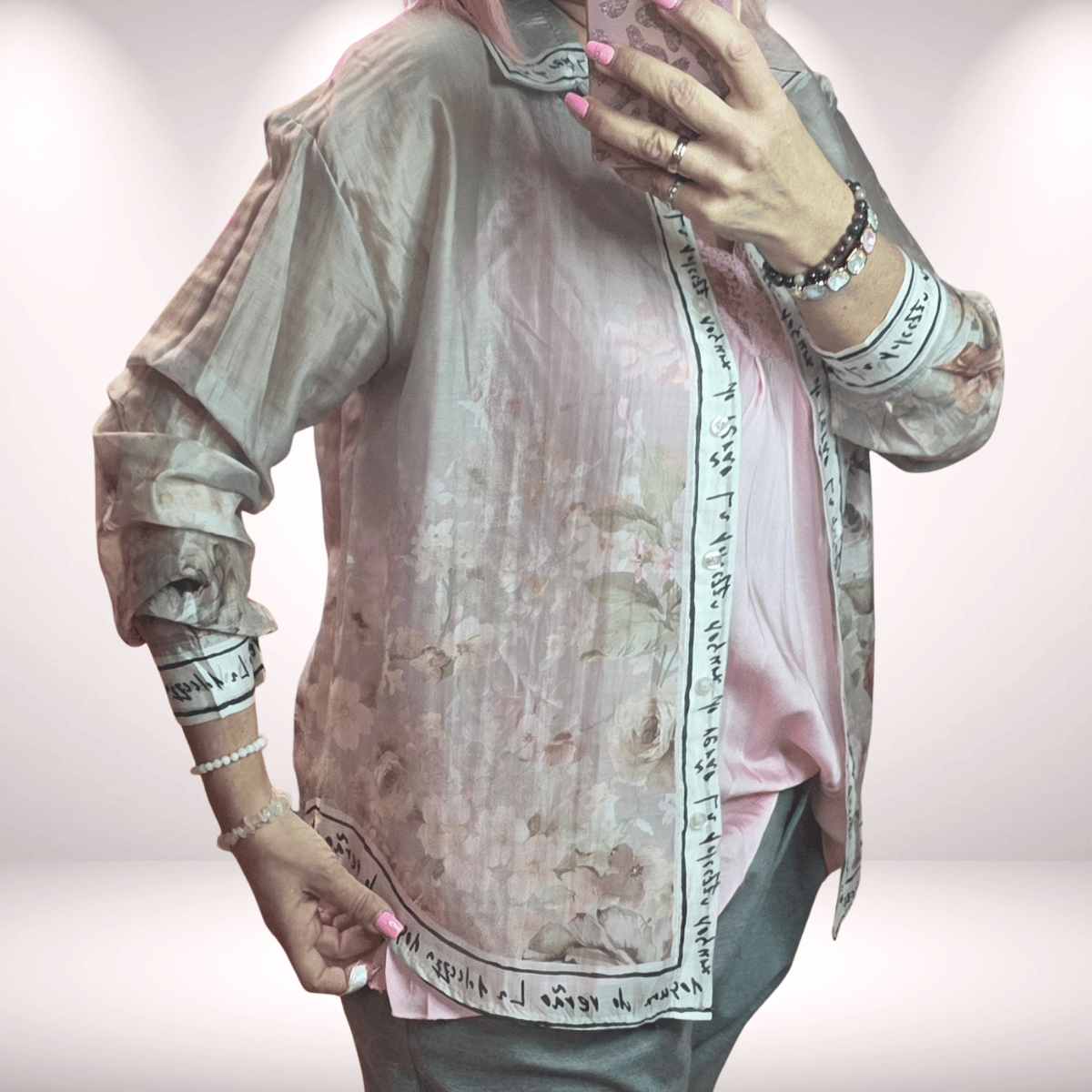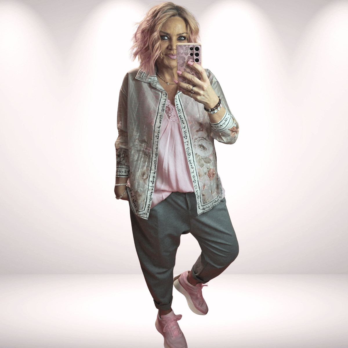 Diese Bluse „Rose“ in Grau/Rosé vereint einen edlen Look mit sportlichen Details. Der Schriftzug an den Ärmeln sowie an Knopfleiste und Kragen setzt moderne Akzente und macht die Bluse zu einem besonderen Hingucker.