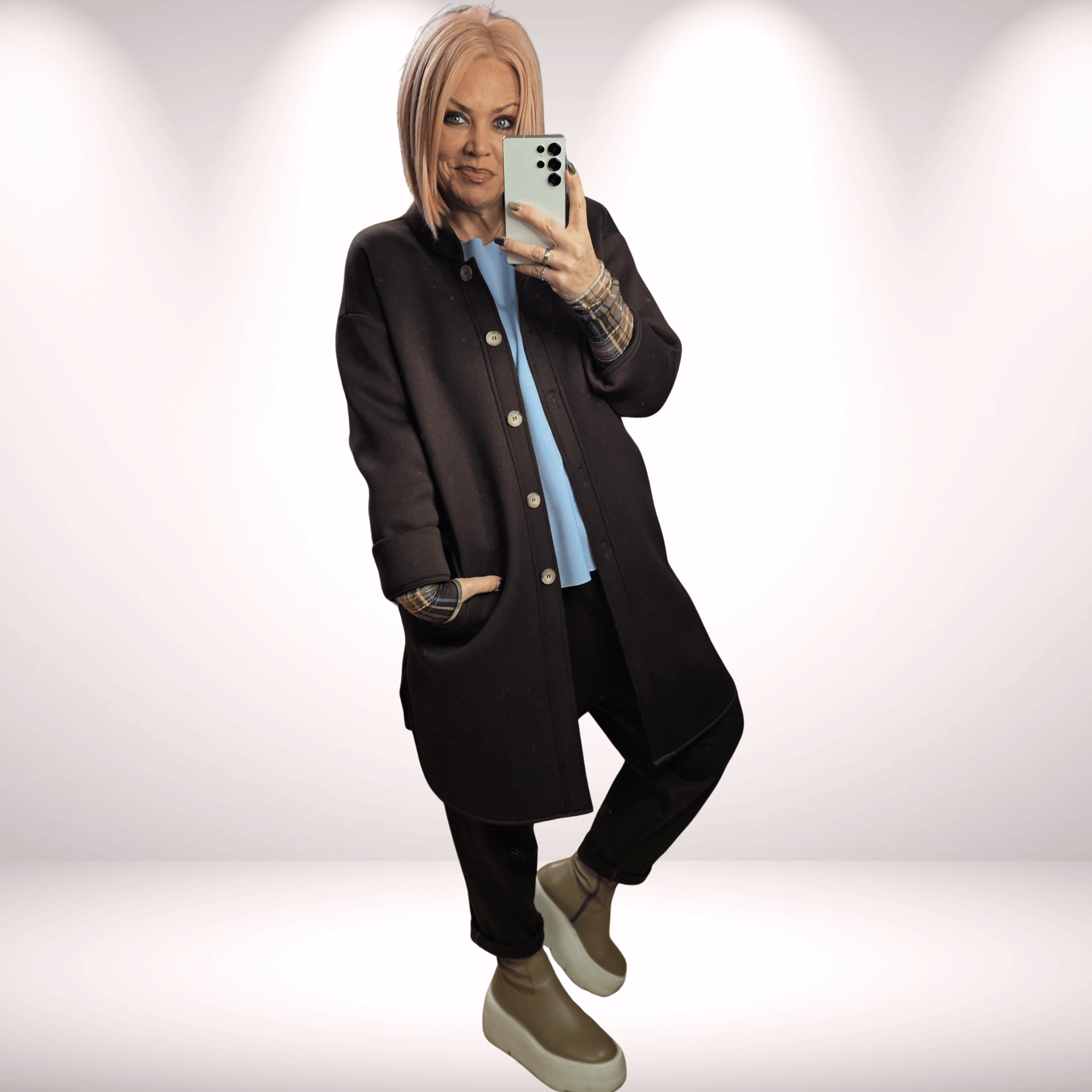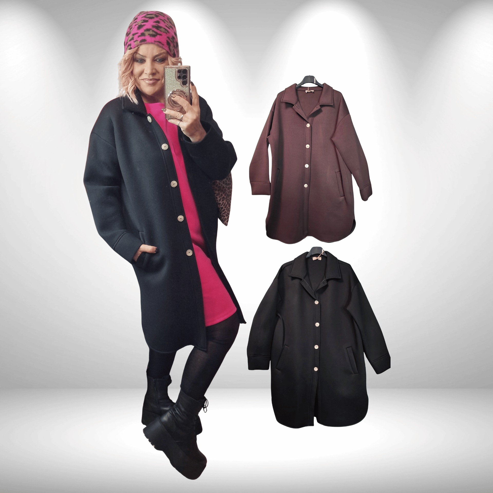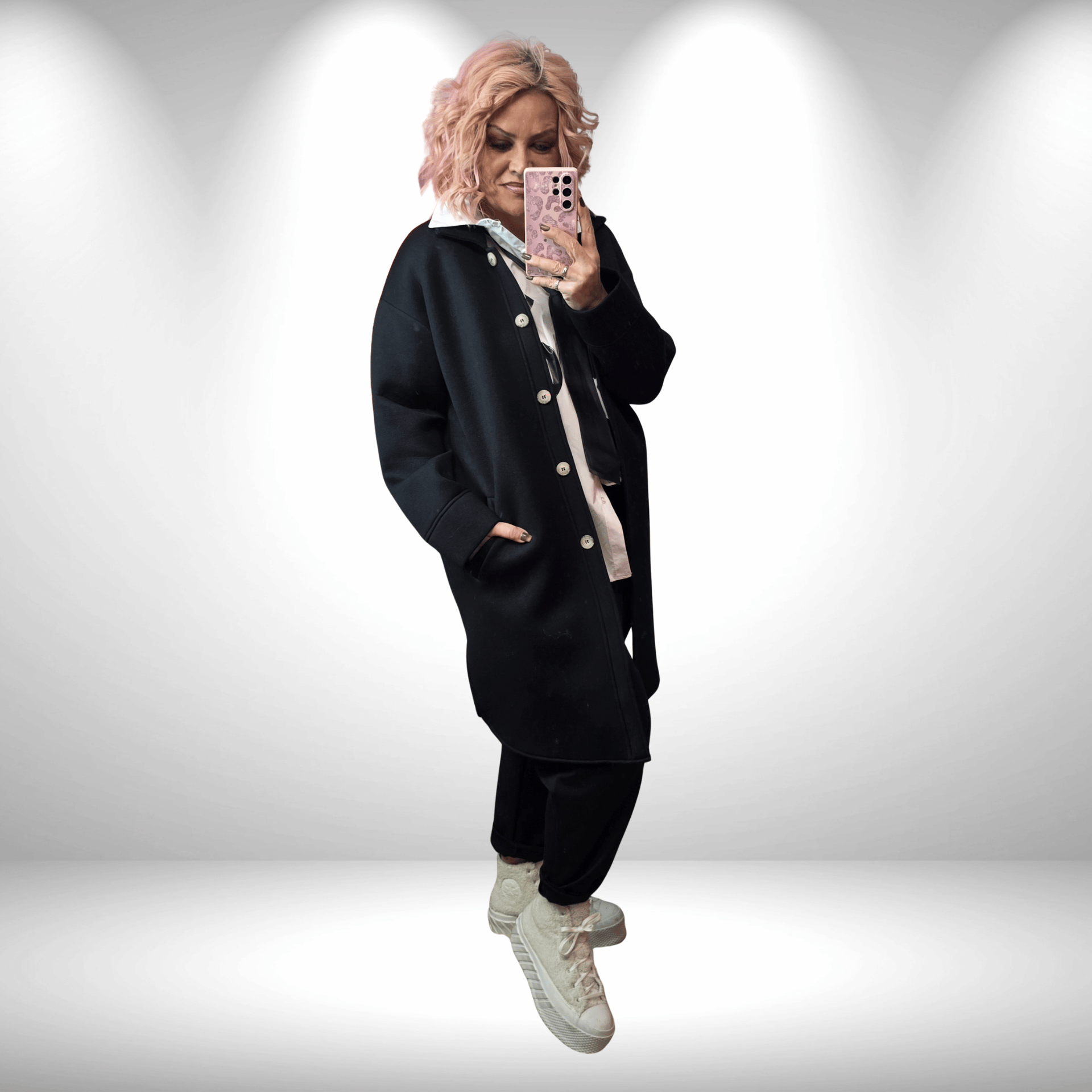 Diese lange Hemdjacke ist ein stylischer Allrounder für Herbst Winter ! Der lockere Schnitt mit seitlichen Schlitzen sorgt für schöne Bewegungsfreiheit, während die seitlichen Eingrifftaschen für den lässigen Look und praktischen Komfort stehen.