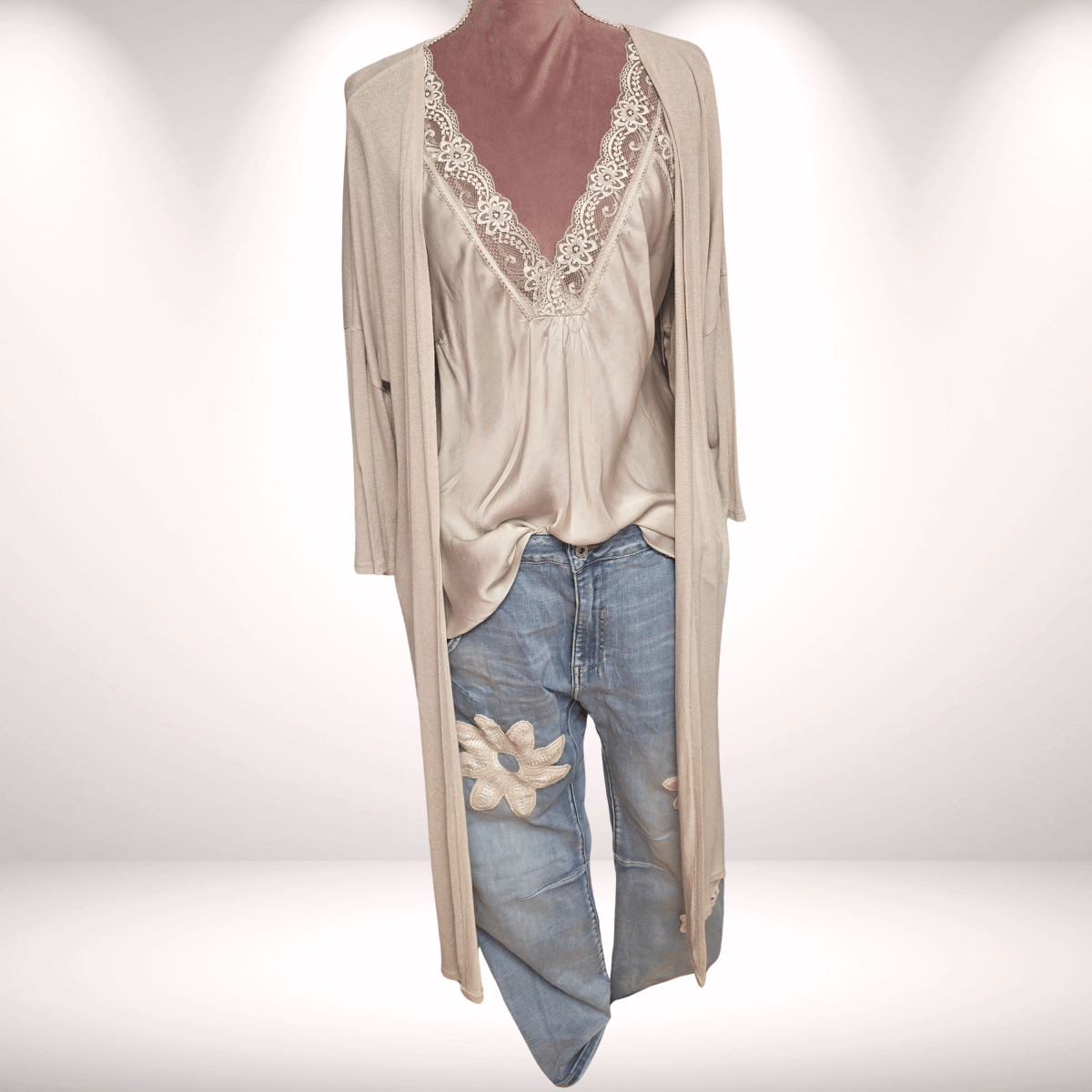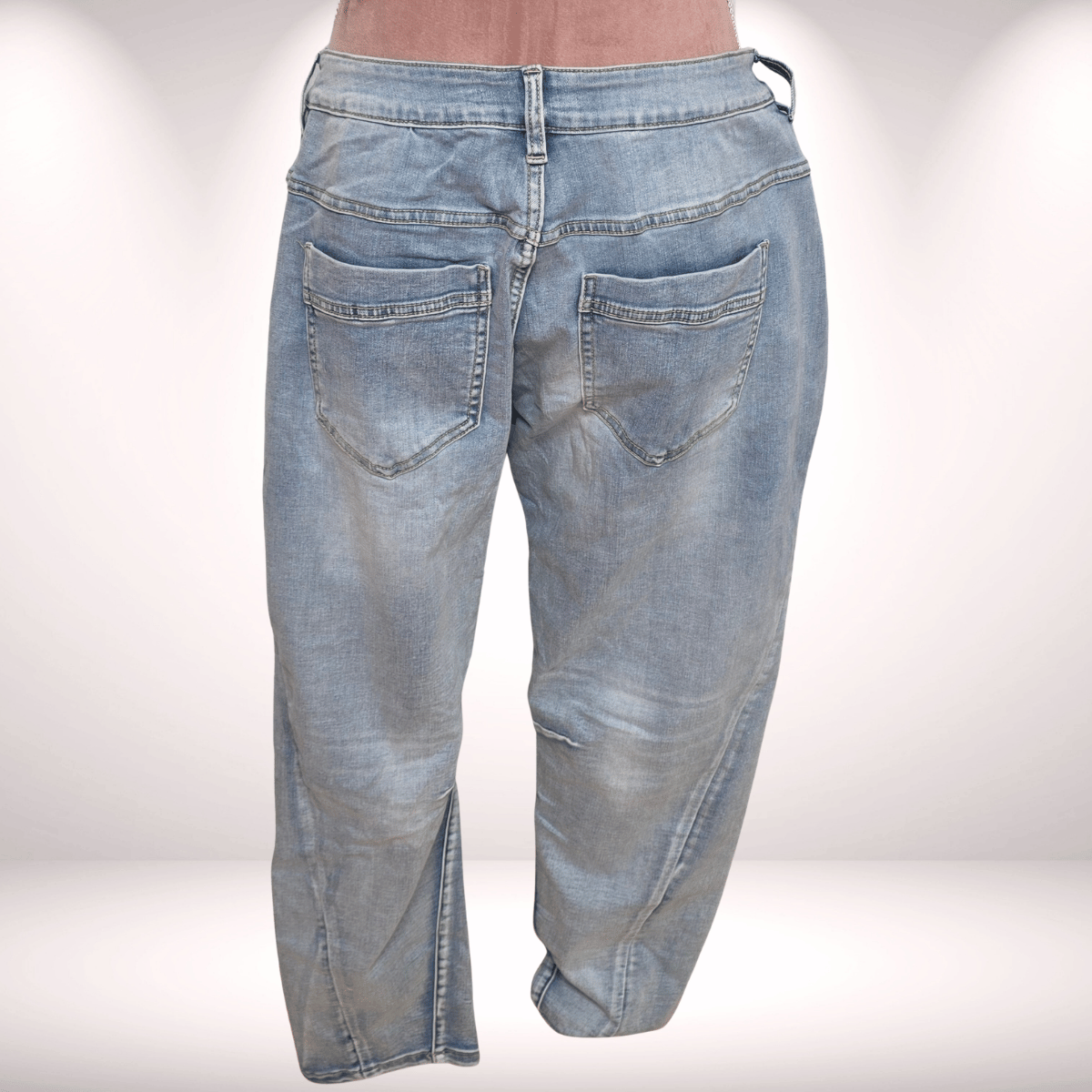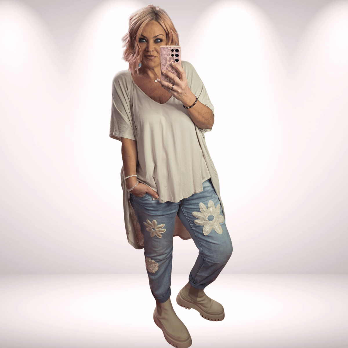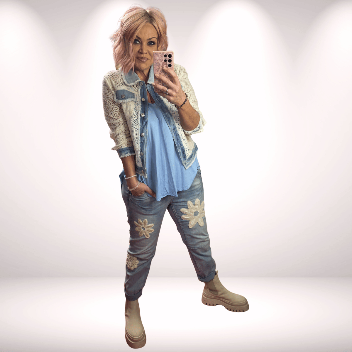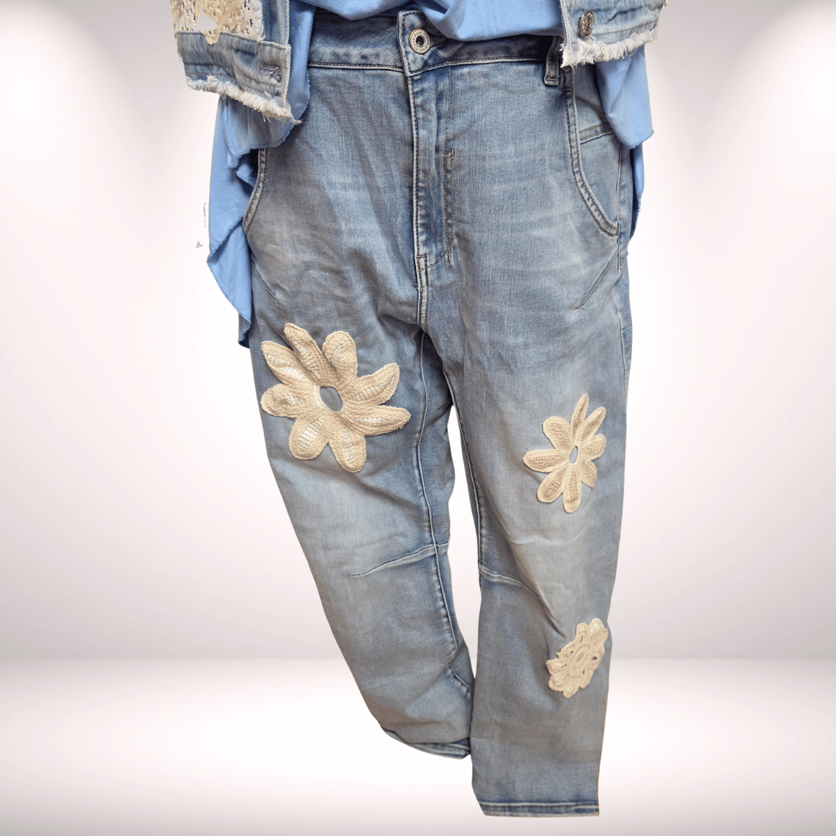 Diese Boho-Jeans im Ibiza-Style bringt echtes Sommer-Feeling in deinen Kleiderschrank. Perfekt kombinierbar mit Beige- und Naturtönen – ideal für entspannte Ibiza- oder Malle-Looks.