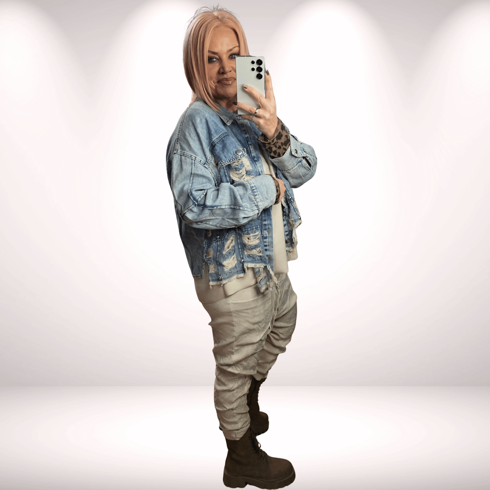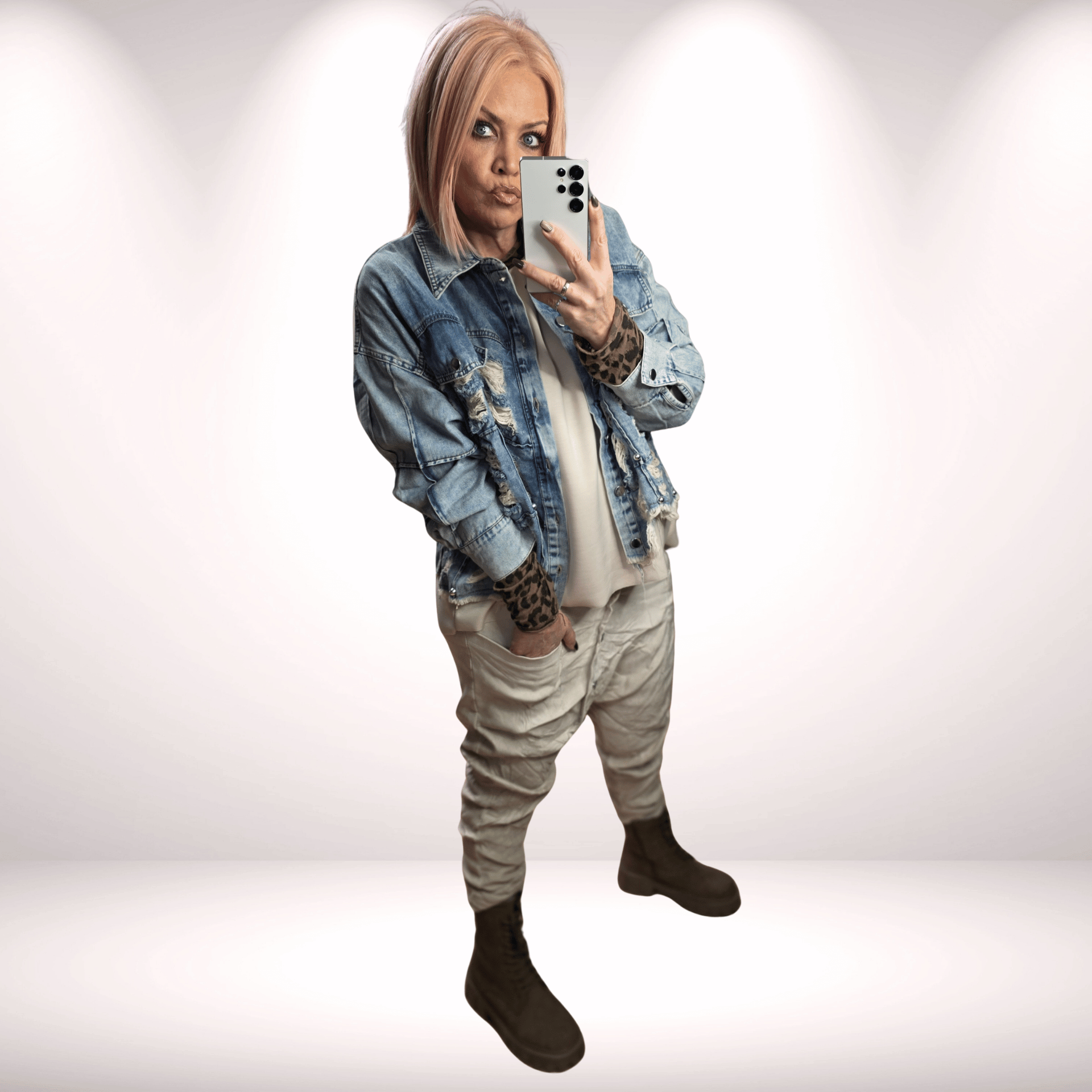 Unsere handgefertigte Jeansjacke im Fetzenstyle ist ein echtes Highlight für alle Fashionistas, die das Besondere lieben! Jede Jacke ist ein Unikat – individuell gefertigt mit stylischen Fransen-Details und cooler Vintage-Waschung. Perfekt für einen lässigen Streetstyle-Look oder als Eyecatcher über Kleidern Blusen Longsleeve u.Shirts