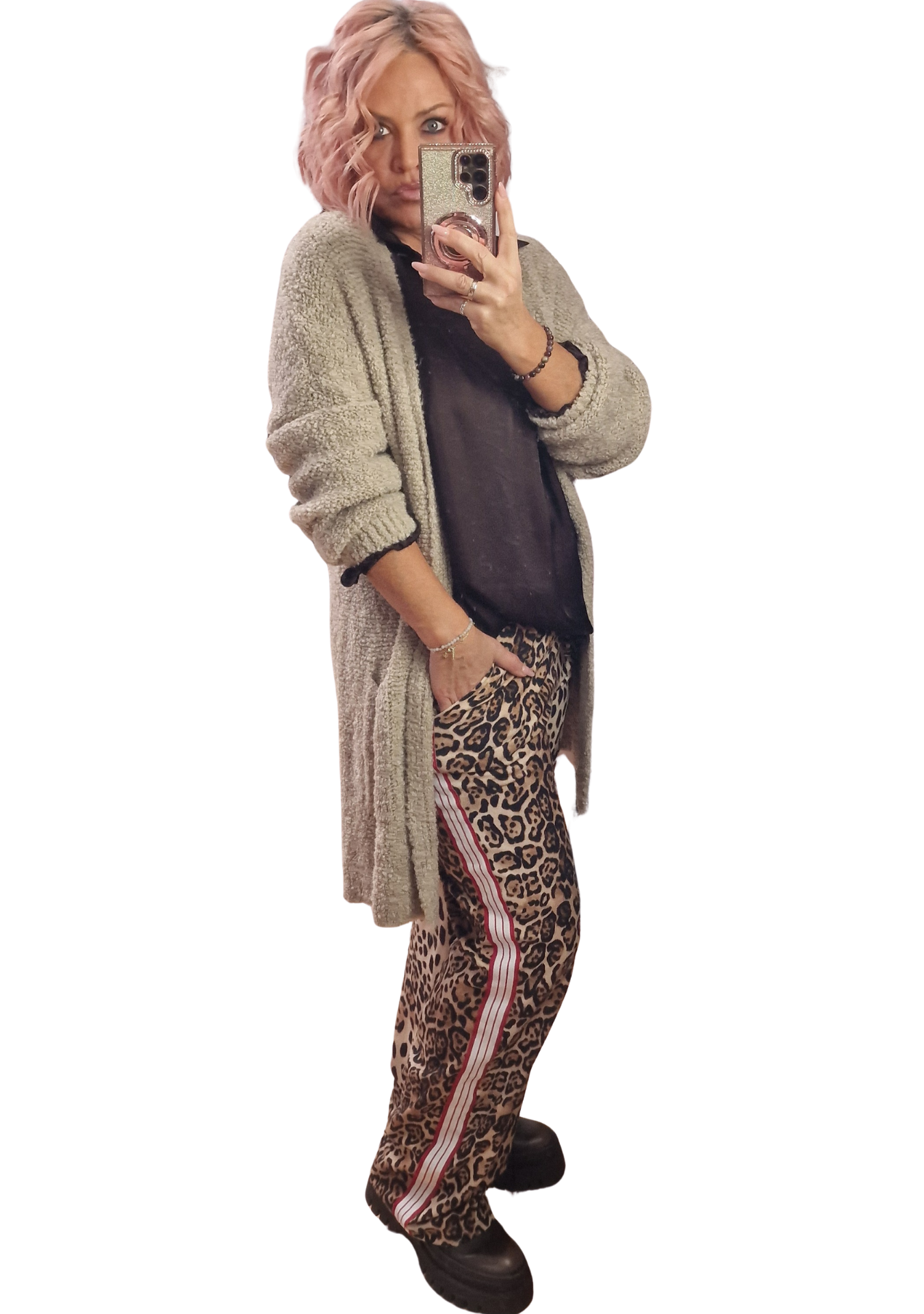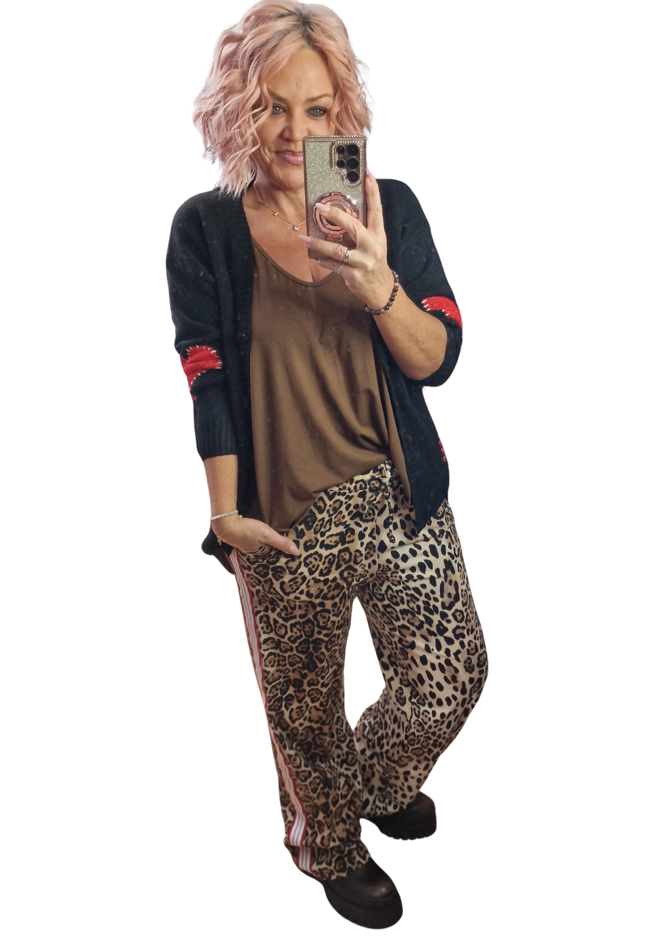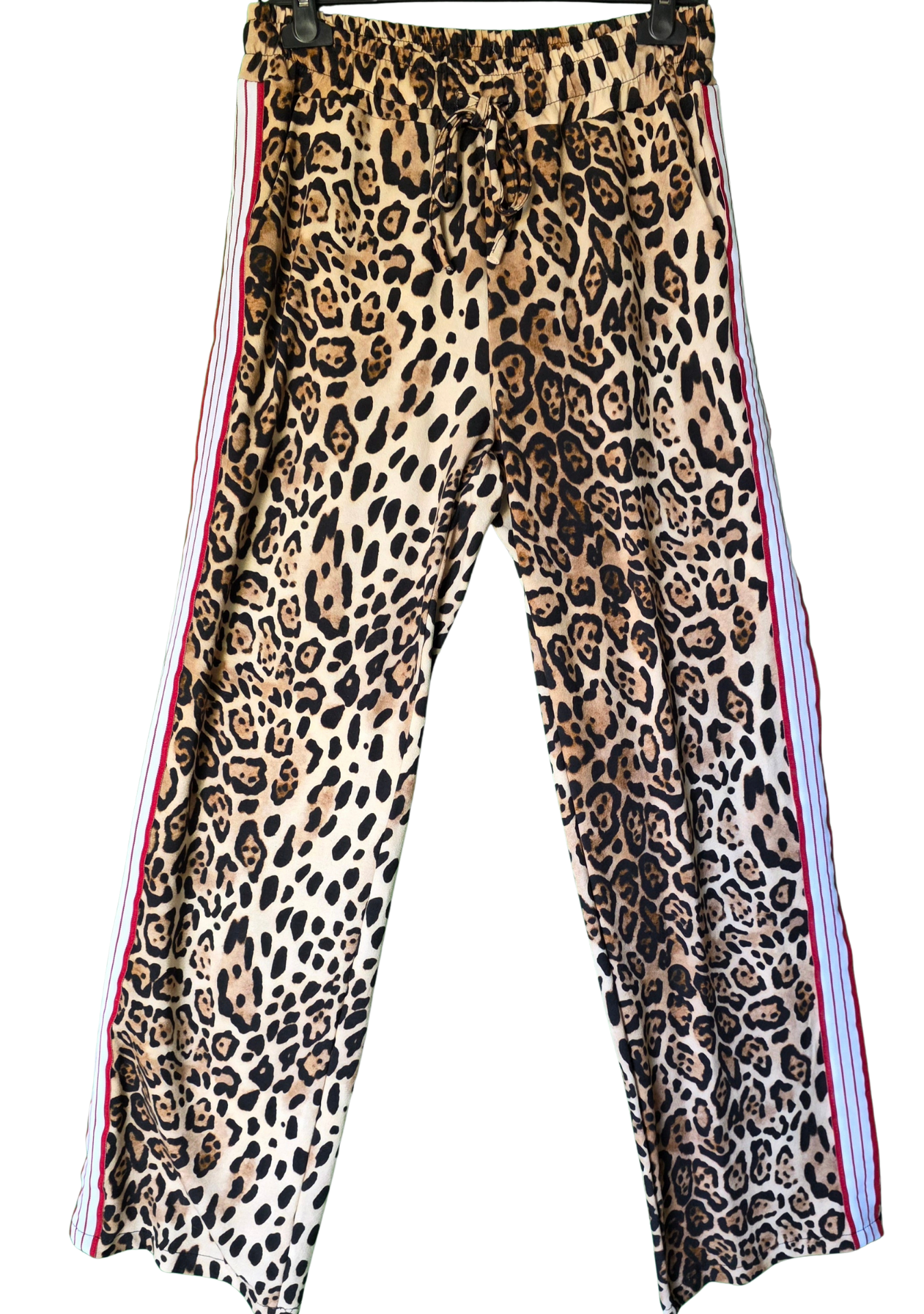 Ein echter Hingucker! Die Leo Marlene Hose mit roten & weißen Streifen kombiniert ein angesagtes Leo-Muster mit sportiven Streifen an der Seite. Lässig, modern und super bequem – perfekt für coole Alltags- oder Ausgeh-Looks.