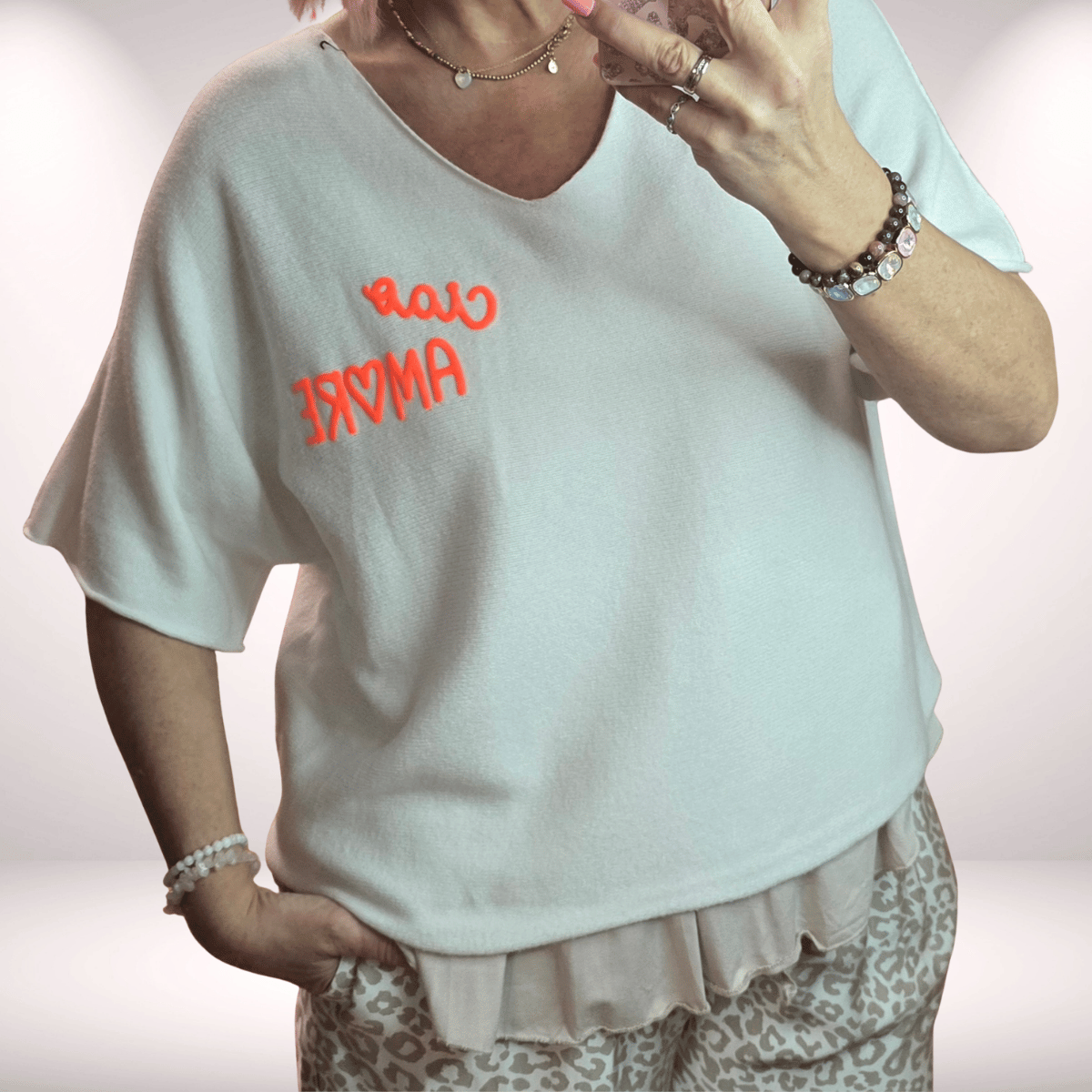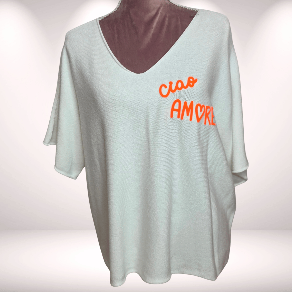 Lieblingspulli „Amore Ciao“ Kurzarm – Offwhite mit Neon Orange