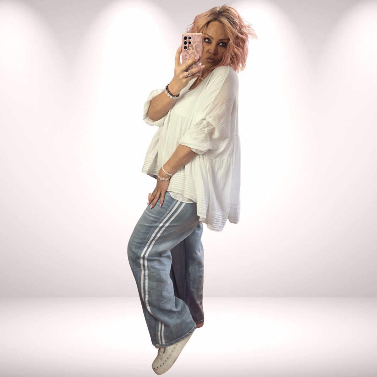 Basic Bluse „Must Have“ – Cozy Look | Weiß & Hellblau Diese Basic Bluse „Must Have“ ist ein echtes Essential für jede Garderobe. Der lockere, trendige Schnitt im Cozy-Style sorgt für maximalen Komfort und eine moderne, entspannte Ausstrahlung. Der V-Ausschnitt, die Ärmel mit Gummizug und der Vokuhila-Schnitt in A-Form verleihen der Bluse eine schöne, figurschmeichelnde Silhouette. Perfekt kombinierbar mit Jeans, Stoffhosen oder Leggings – ideal für lässige und stilvolle Alltagslooks. Erhältlich in 2 Farben: Weiß Hellblau Maße: Achsel zu Achsel: ca. 90 cm Länge vorne: ca. 61 cm Länge hinten: ca. 73 cm Größe: Onesize – passend bis ca. Gr. 46 Material: 100 % Baumwolle Eine leichte, sportlich-elegante Bluse für jeden Tag – bequem, modern und vielseitig kombinierbar. ✨