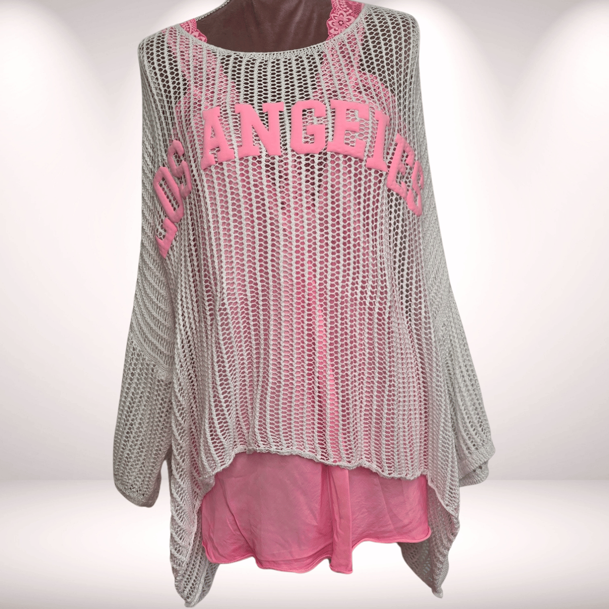 Netzpulli „Los Angeles“ Print Neonrosa – Weiß