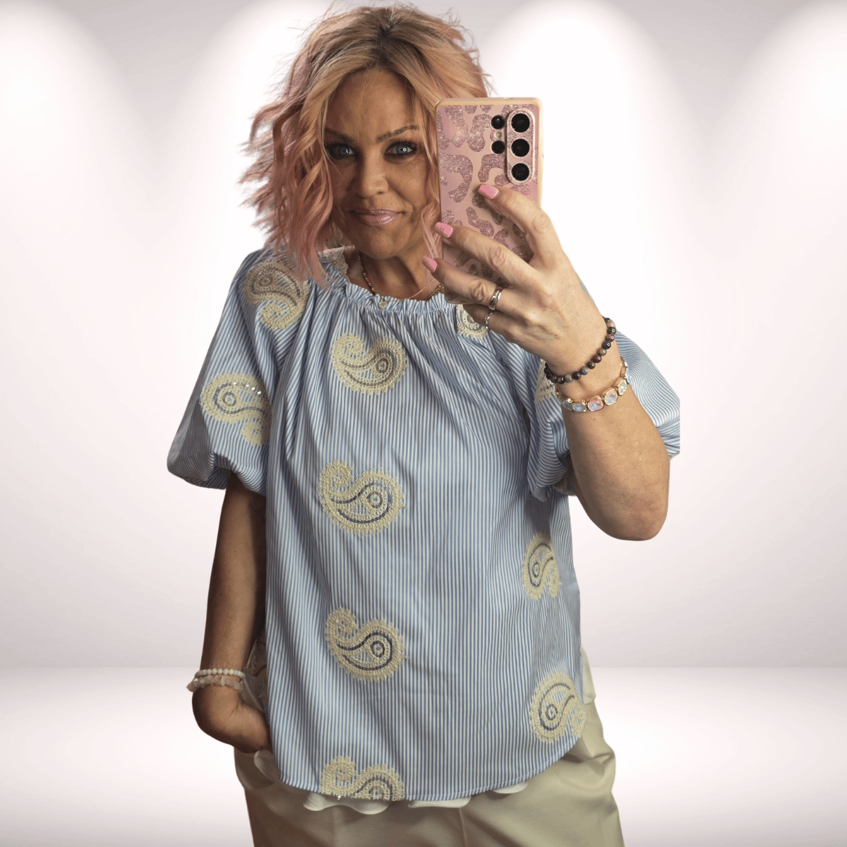 Eine luftige Bluse mit besonderem Muster – perfekt für sommerliche, feminine Looks. ☀️✨