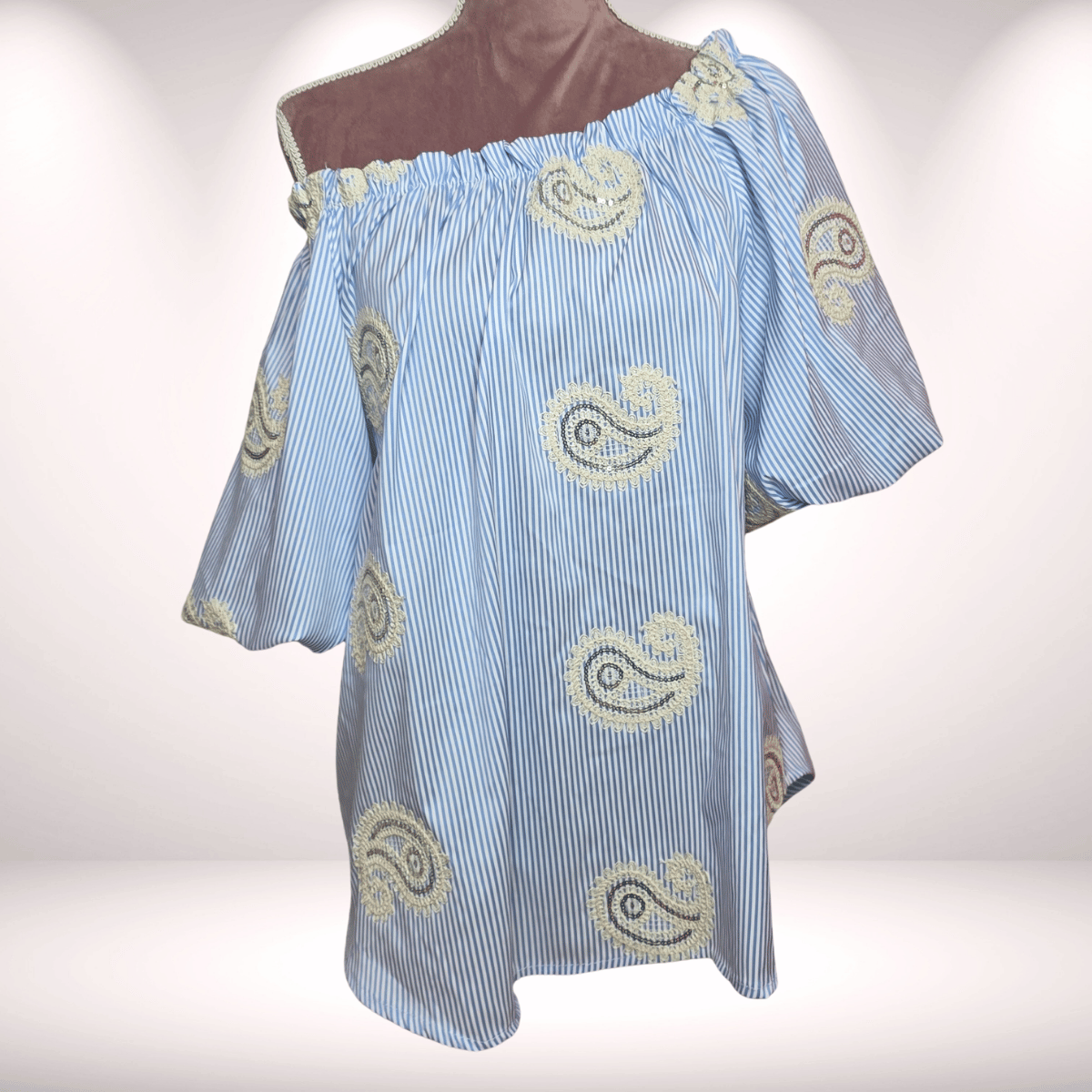 Diese Offshoulder Bluse in Blau/Weiß überzeugt mit einer wunderschönen Boho Musterung stickerei in Kombination mit feinen Streifen. Der schulterfreie Schnitt sorgt für einen femininen, sommerlichen Look und setzt deine Schultern perfekt in Szene.