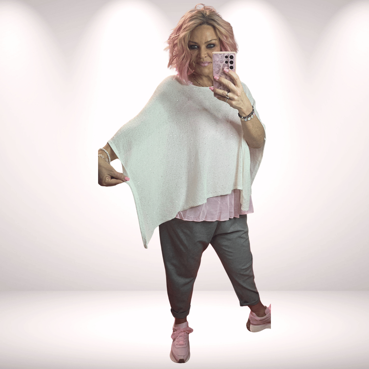 Der Poncho „Glitzi“ in Offwhite ist ein elegantes Highlight für stilvolle Looks. Die feinen, eingearbeiteten Glitzersteinchen verleihen dem Poncho eine edle Ausstrahlung und machen ihn zu einem besonderen Hingucker.