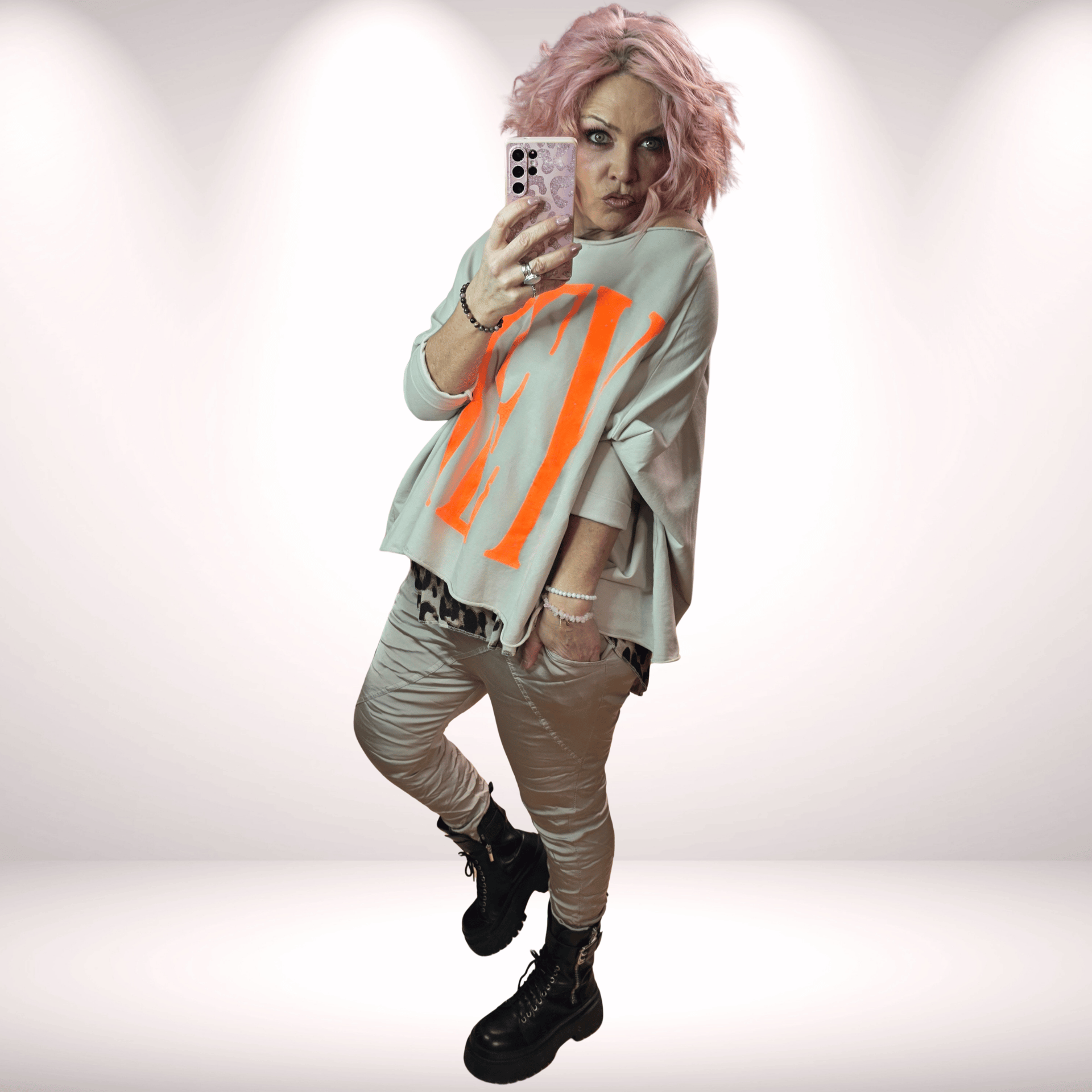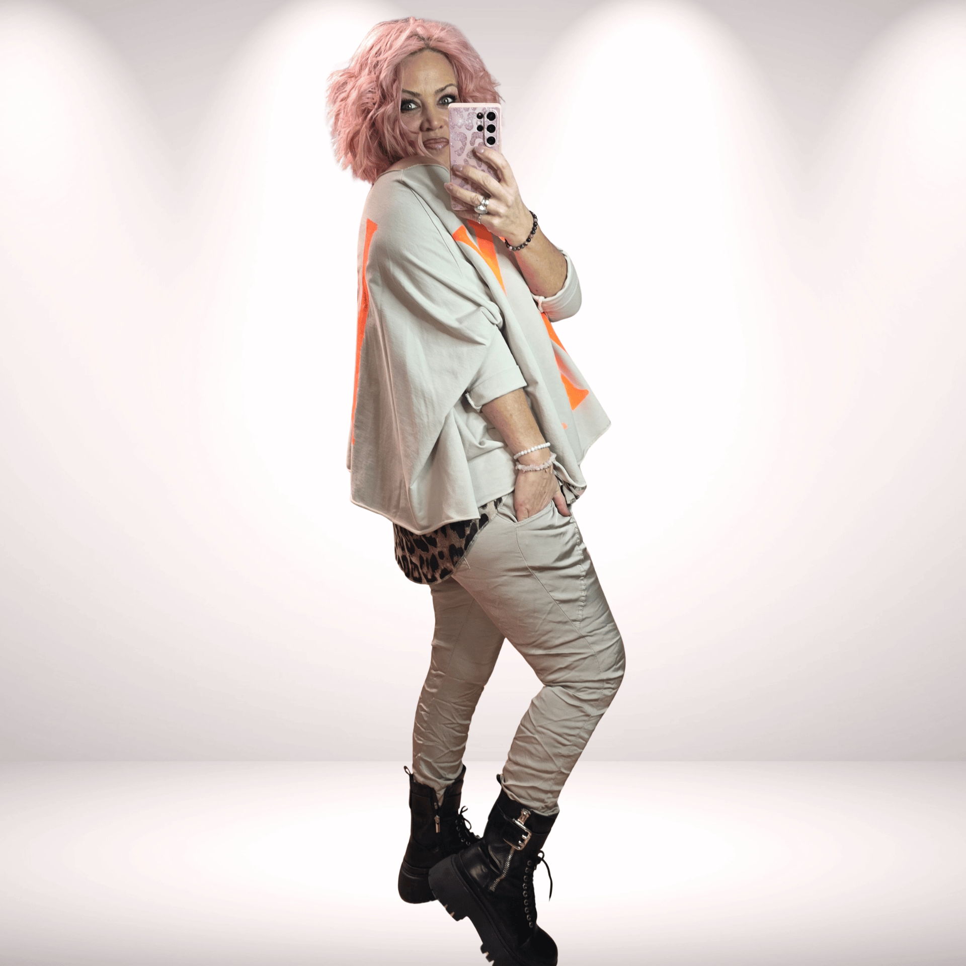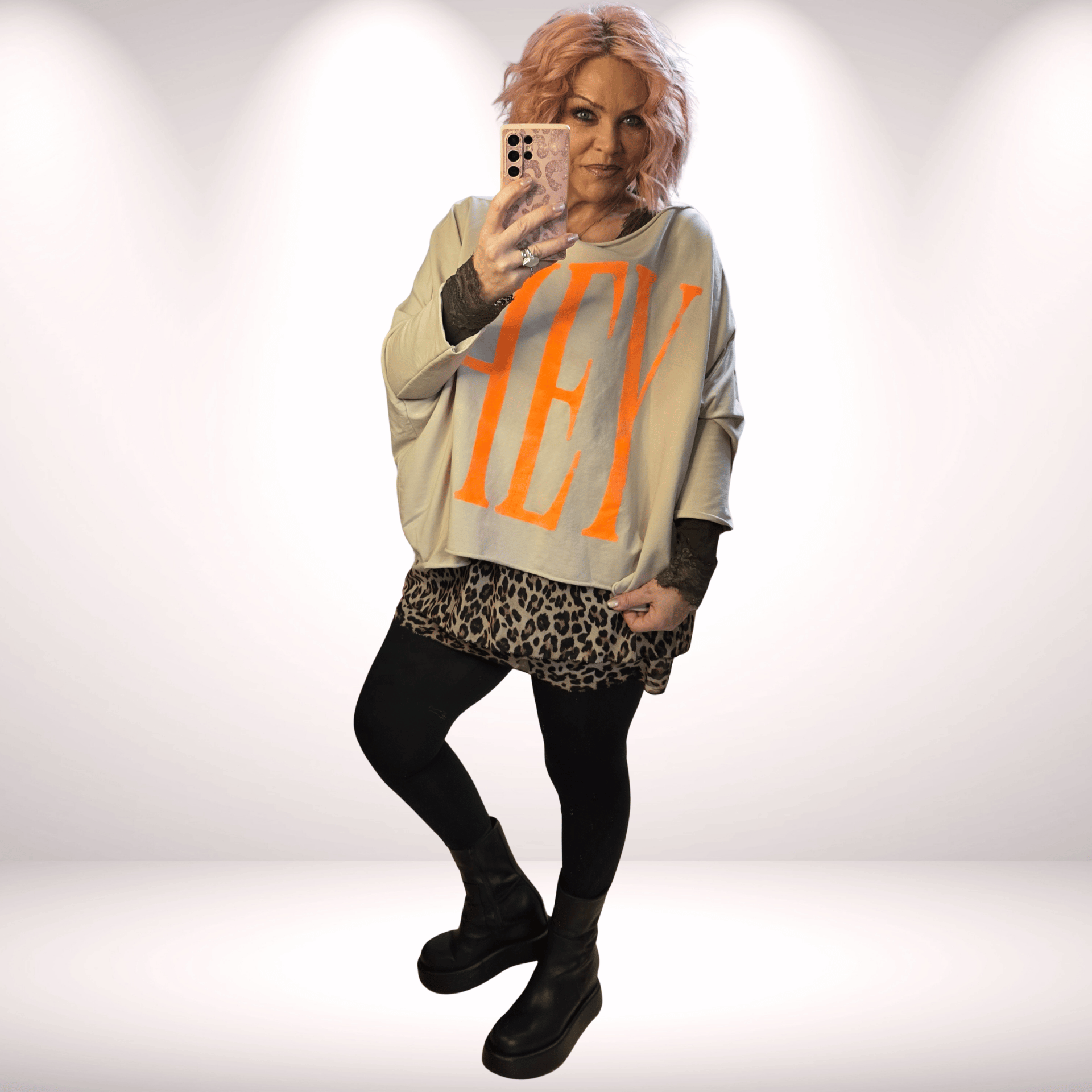 Hey you! 😍 Dieser Poncho Sweater in Beige setzt mit seinem neon-orangen Schriftzug „HEY YOU“ ein klares Fashion-Statement. Der große Rundhalsausschnitt und der kastige poncho schnitt sorgen für einen entspannten Oversize-Look mit maximalem Komfort. Perfekt für coole Alltagsstyles, Streetwear-Vibes oder gemütliche Casual-Outfits. ✨