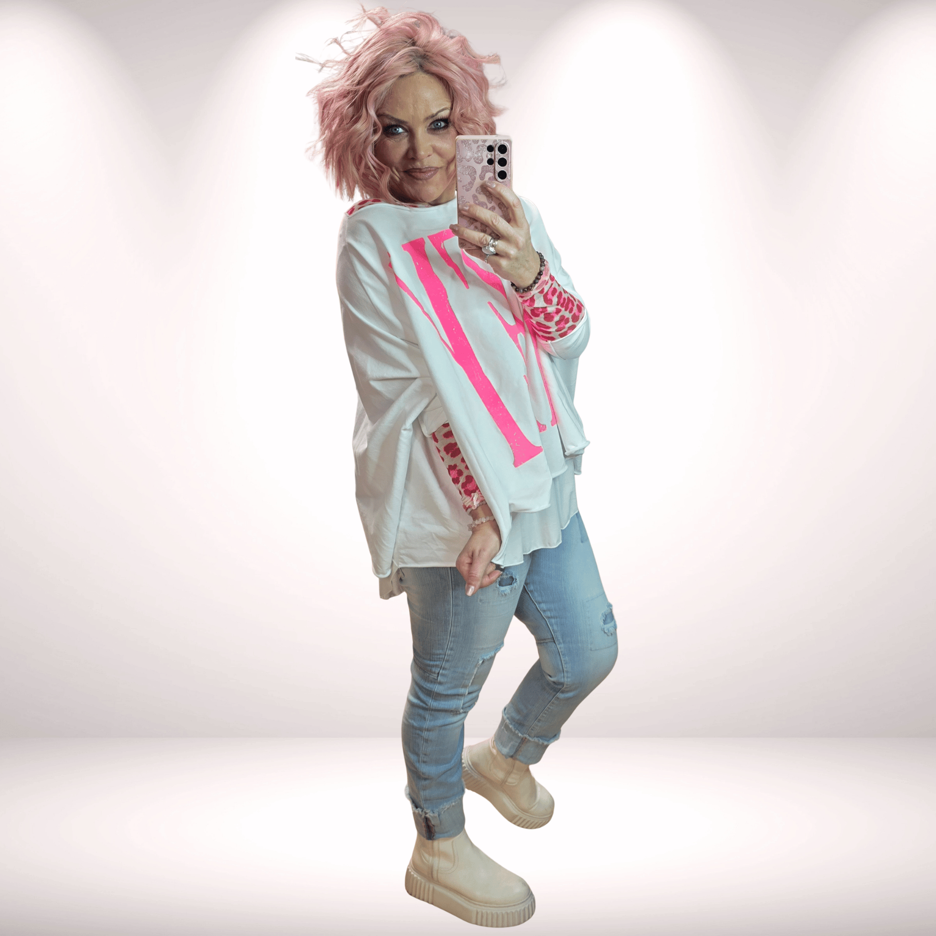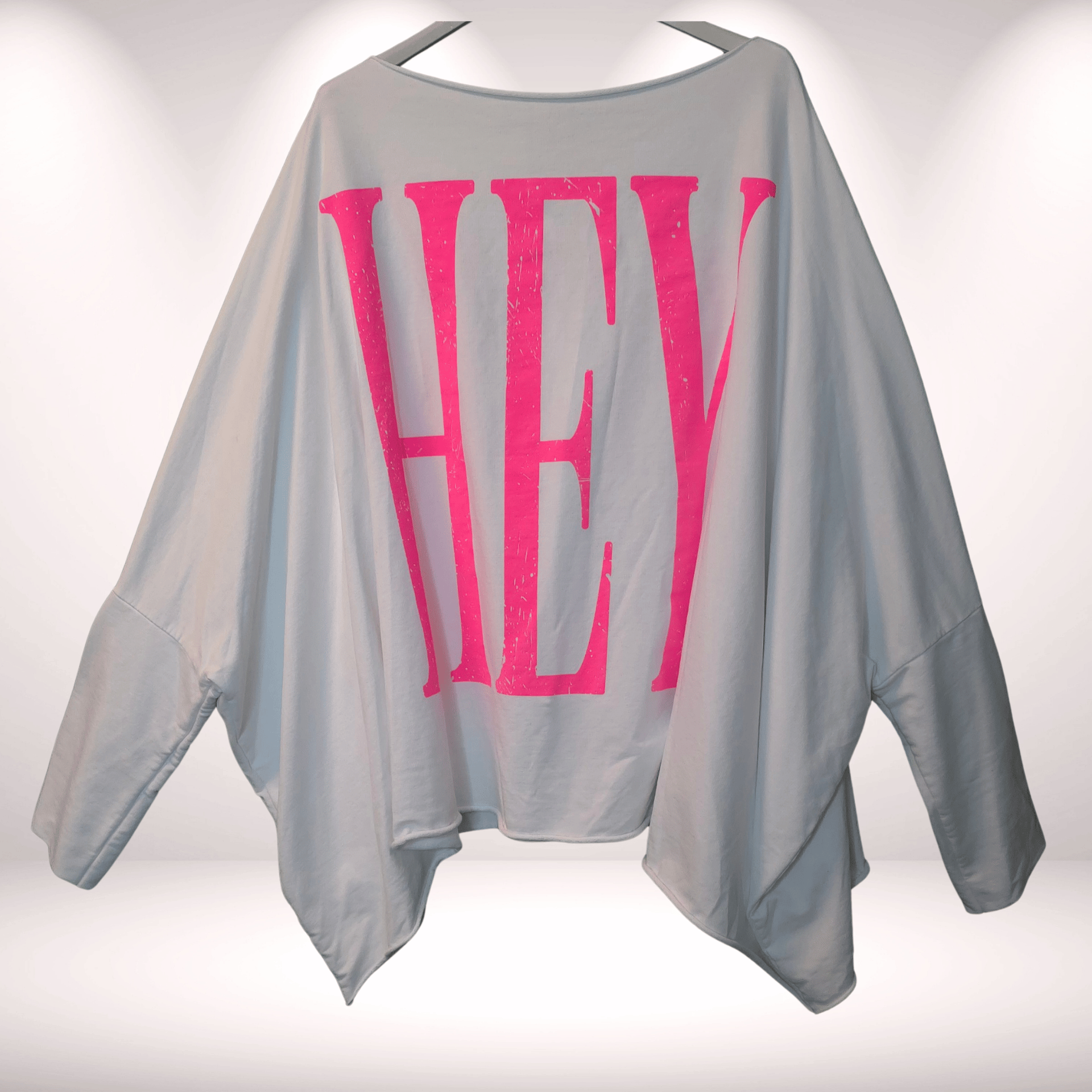 Hey you! 😍 Dieser Poncho Sweater in Weiß setzt mit seinem neon-pinken Schriftzug „HEY YOU“ ein klares Fashion-Statement. Der große Rundhalsausschnitt und der kastige poncho Schnitt sorgen für einen entspannten Oversize-Look mit maximalem Komfort. Perfekt für coole Alltagsstyles, Streetwear-Vibes oder gemütliche Casual-Outfits. ✨