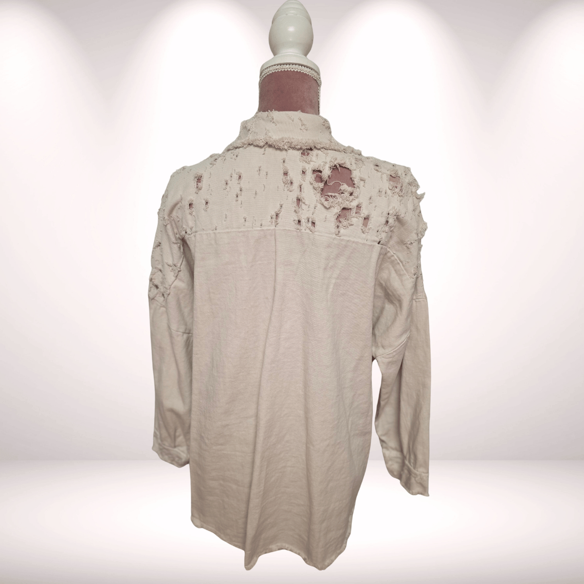 Die zwei großen, handgearbeiteten Brusttaschen unterstreichen den Handmade-Charakter und setzen stylische Akzente. Der Schnitt ist vorne kürzer als hinten, was für eine moderne Silhouette sorgt und perfekt zu Jeans, Leggings oder Kleidern passt.
