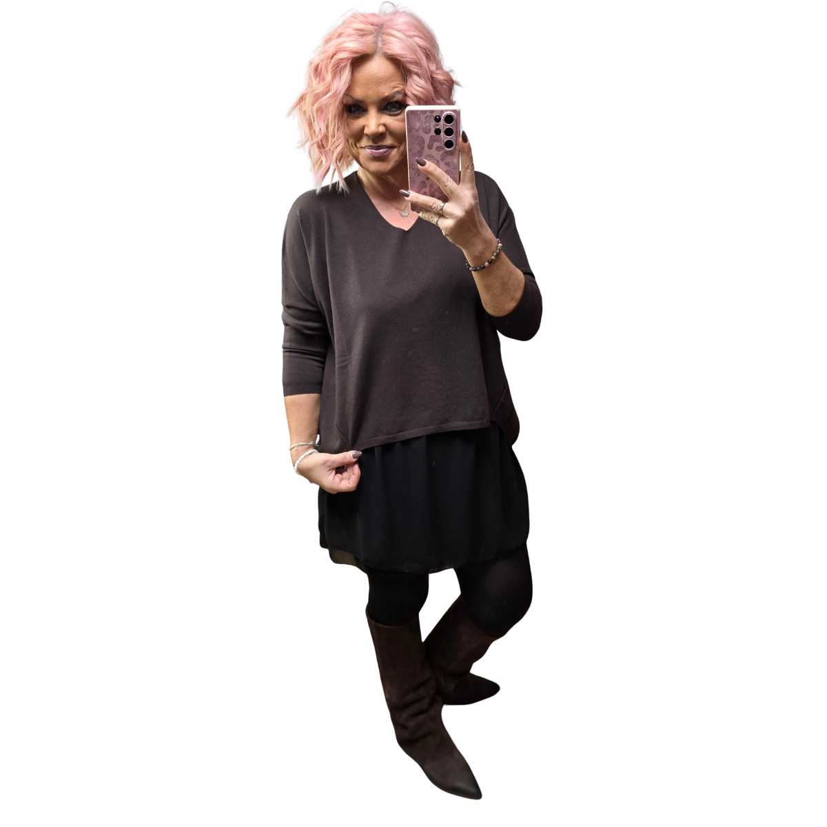 Unser doppellagiger  Rock 2 in 1 kann klassisch als Rock oder stylisch als Blusenverlängerung getragen werden – perfekt für moderne Layering-Outfits.
