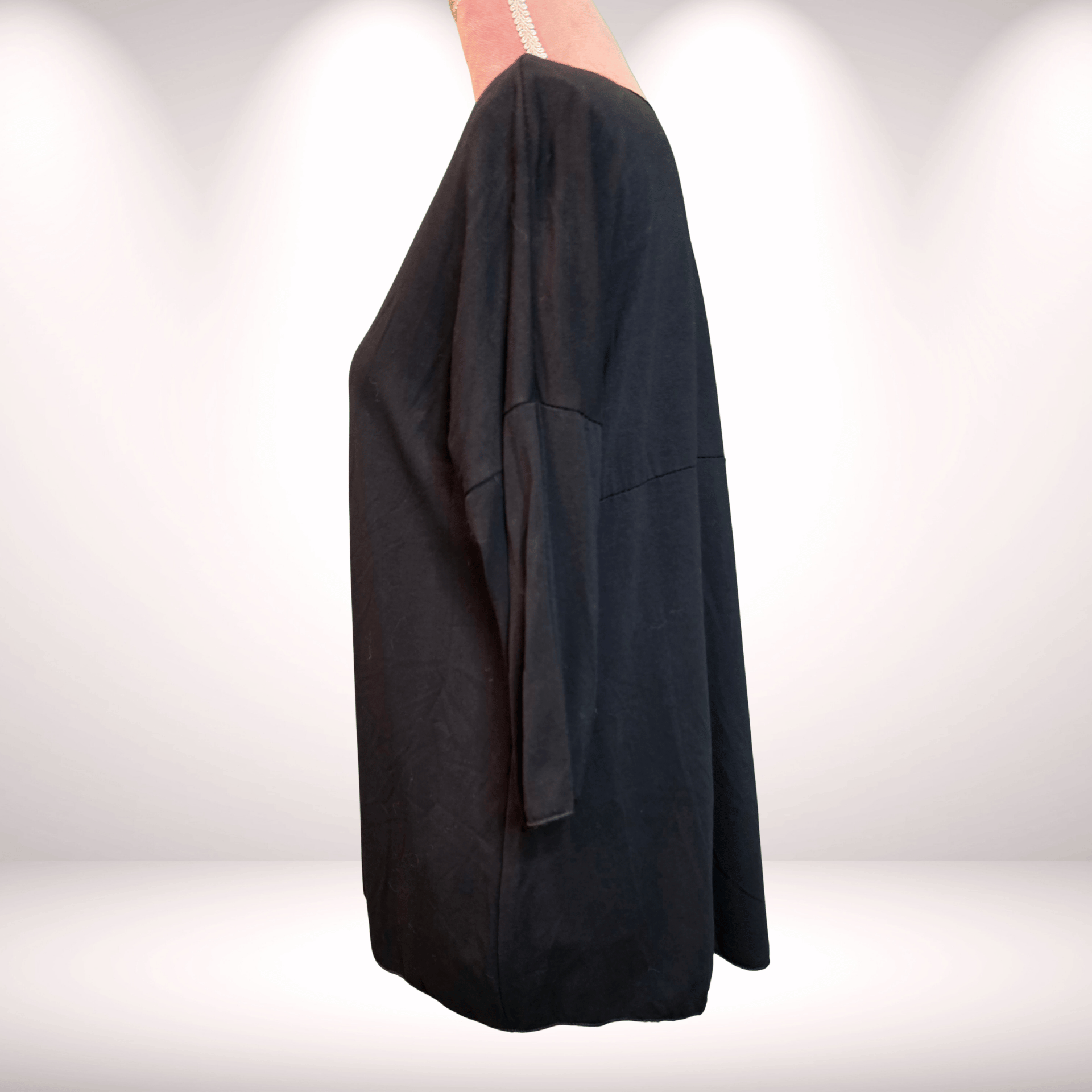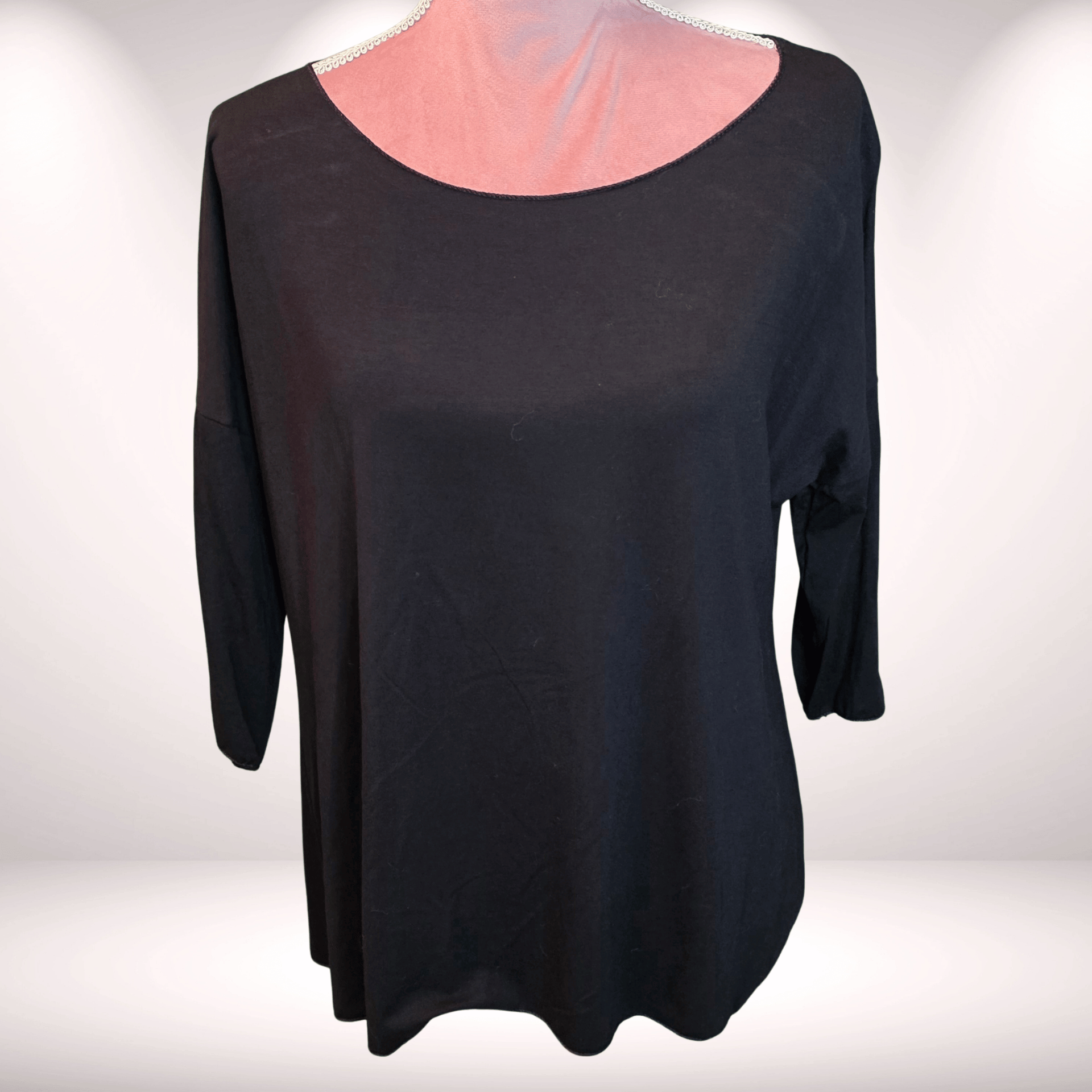 Ein echtes Must-Have für jede Garderobe! Dieses schlichte, aber stylische Basic Shirt in Schwarz überzeugt durch seinen lässigen Schnitt mit leicht verlängertem Rückenteil. Ob solo getragen oder als Kombiteil unter Blazer, Strickjacke oder Mantel – dieses Shirt passt immer.