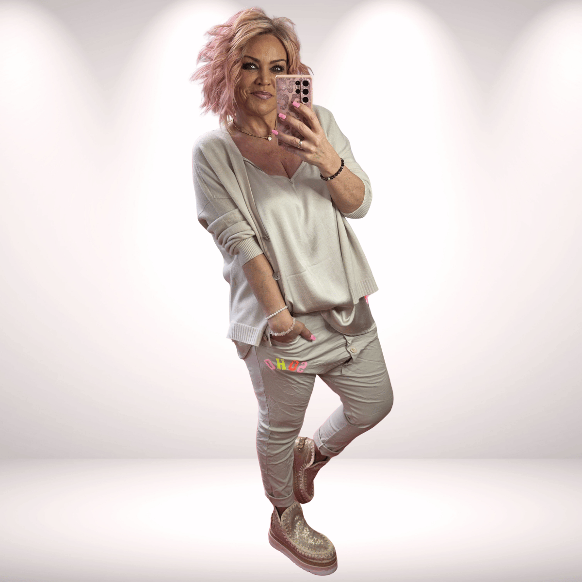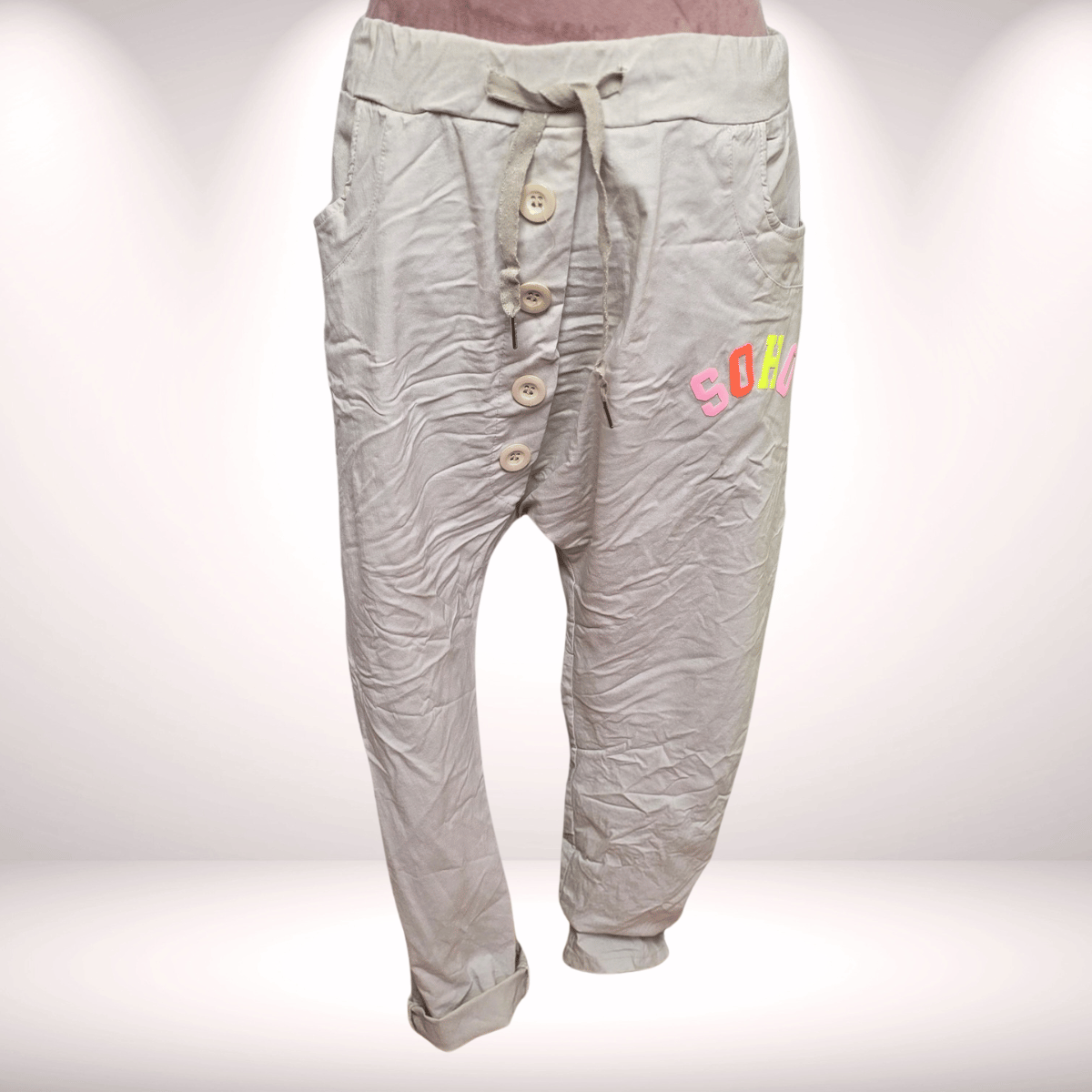 Ein besonderes Detail ist die Knopfleiste vorne, die der Hose einen modernen und trendigen Look verleiht. Der elastische Bund passt sich angenehm an und sorgt für eine bequeme Passform. Perfekt kombinierbar mit Shirts, Tops oder Blusen.