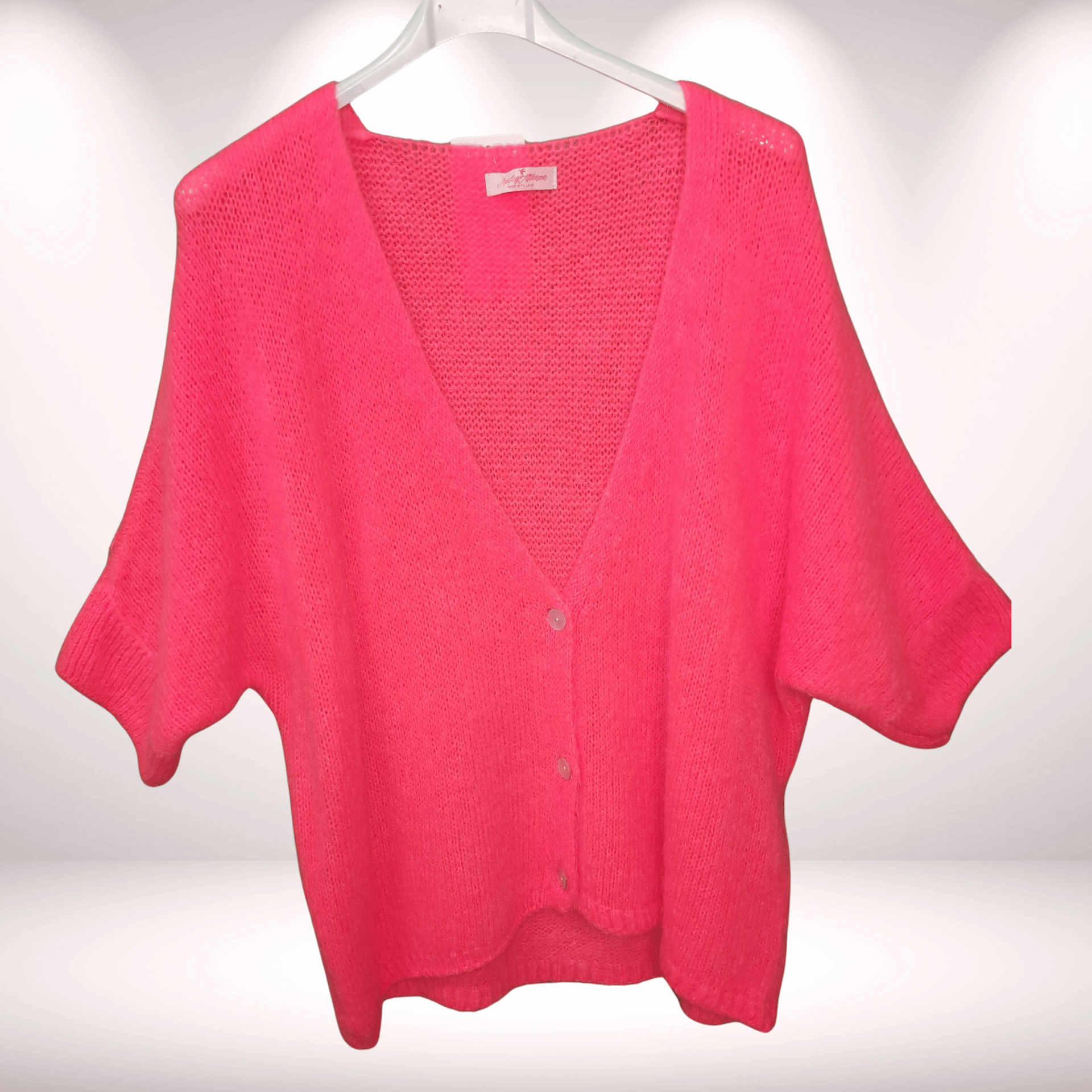 Diese wunderschöne Strickjacke in Neon Coralle ist ein echter Eyecatcher und bringt jedes Outfit sofort zum Strahlen! Der halbarm / 3/4-Schnitt macht sie ideal zum Layern, und der große V-Ausschnitt zum Knöpfen zaubert eine feminine, moderne Silhouette.