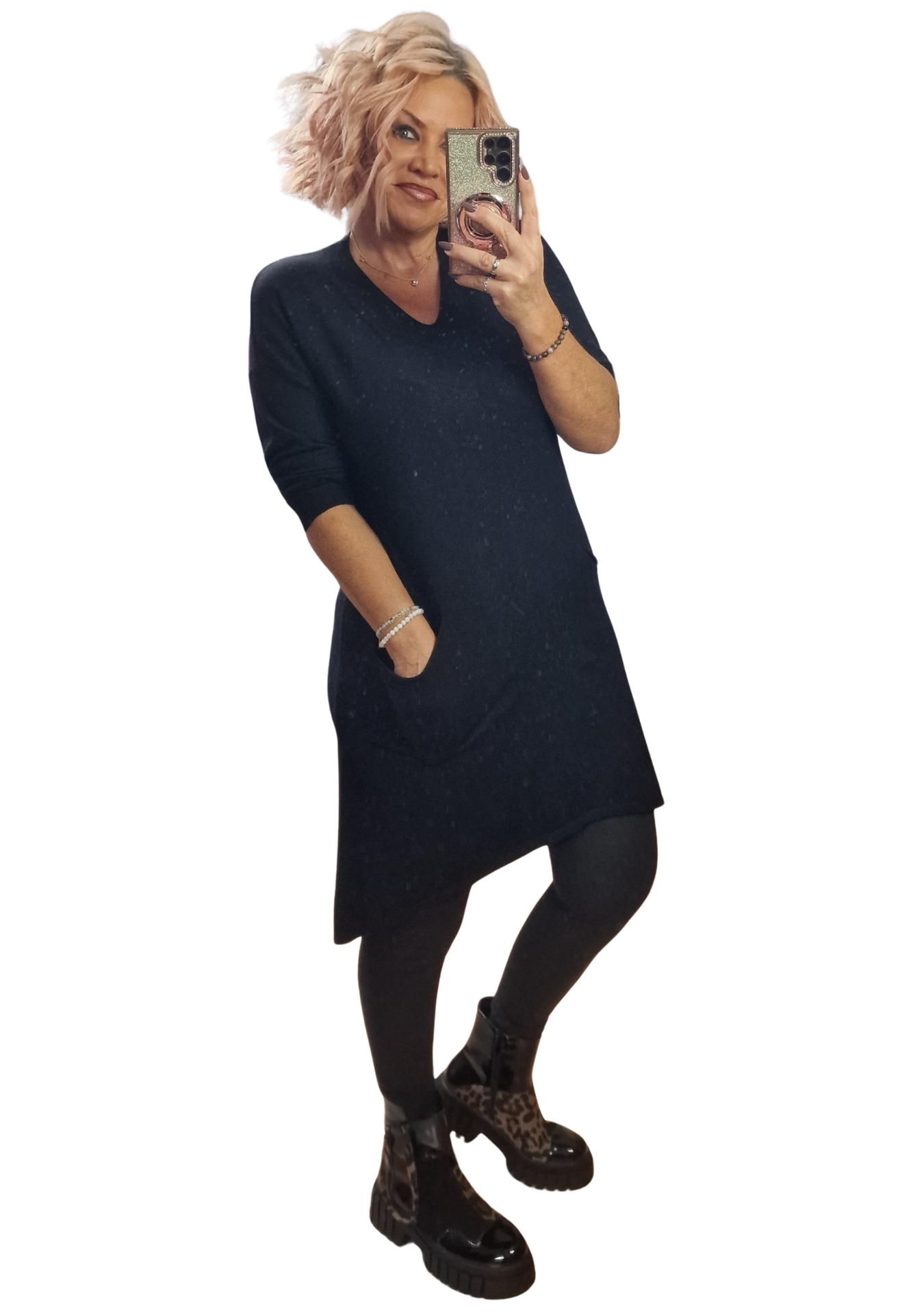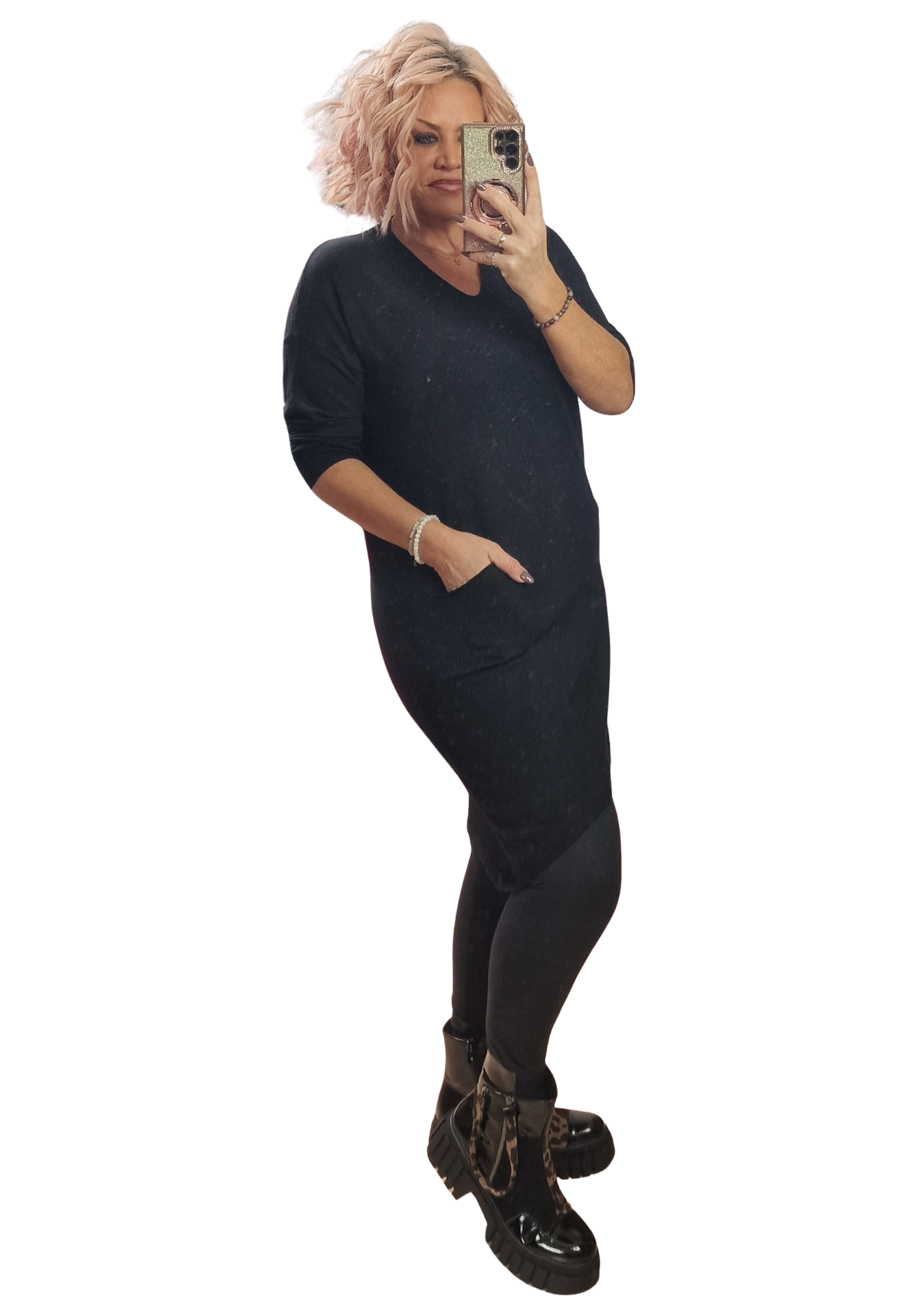 Der feminine V-Ausschnitt schmeichelt deinem Dekolleté, während die praktischen Taschen das Kleid zum absoluten Alltags-Liebling machen. Der leicht Vokuhila-Schnitt (vorne kürzer, hinten länger) sorgt für eine tolle Silhouette!