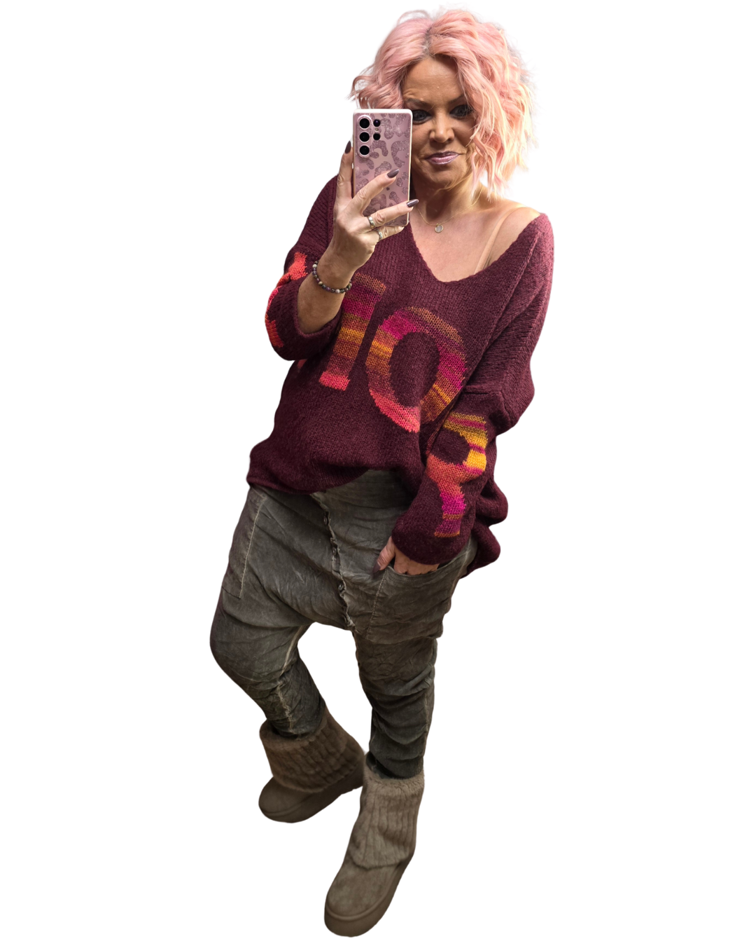đź’« Farben: Offwhite & Bordeaux das einestrickte AMOUR in bunten farben rundet dieses trendige teilchen wunderbar auf .