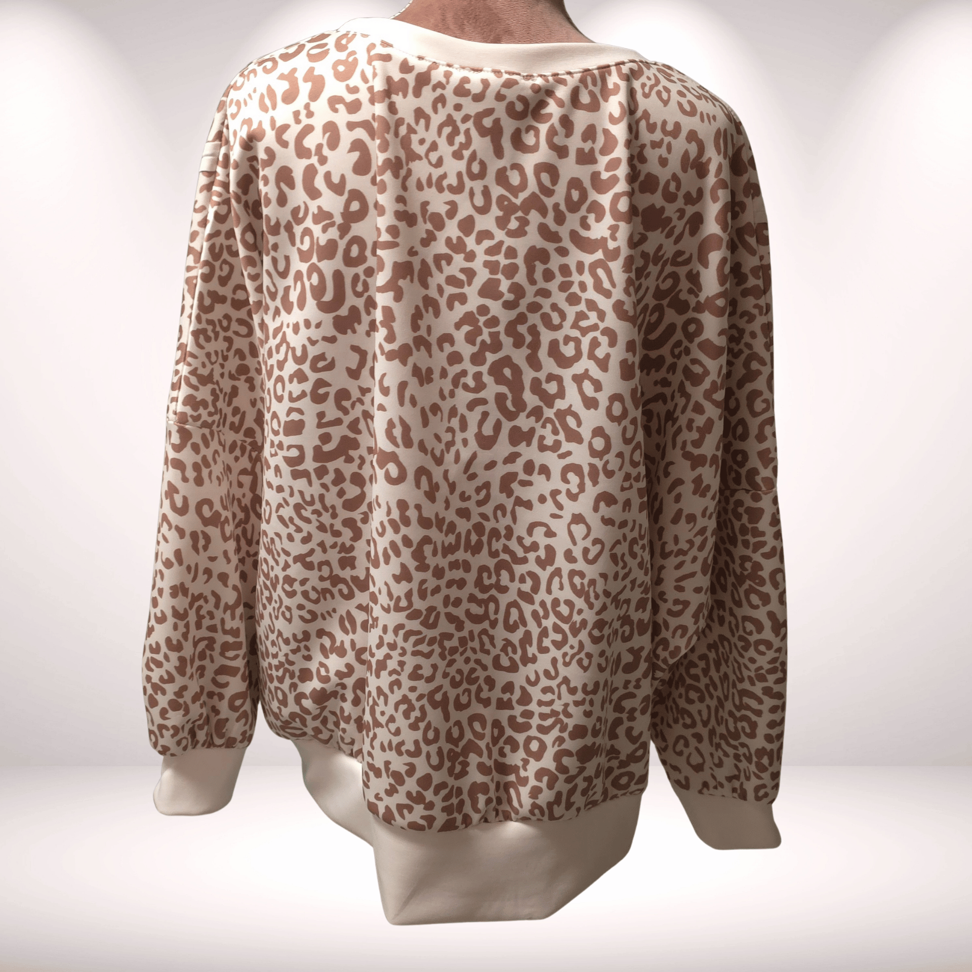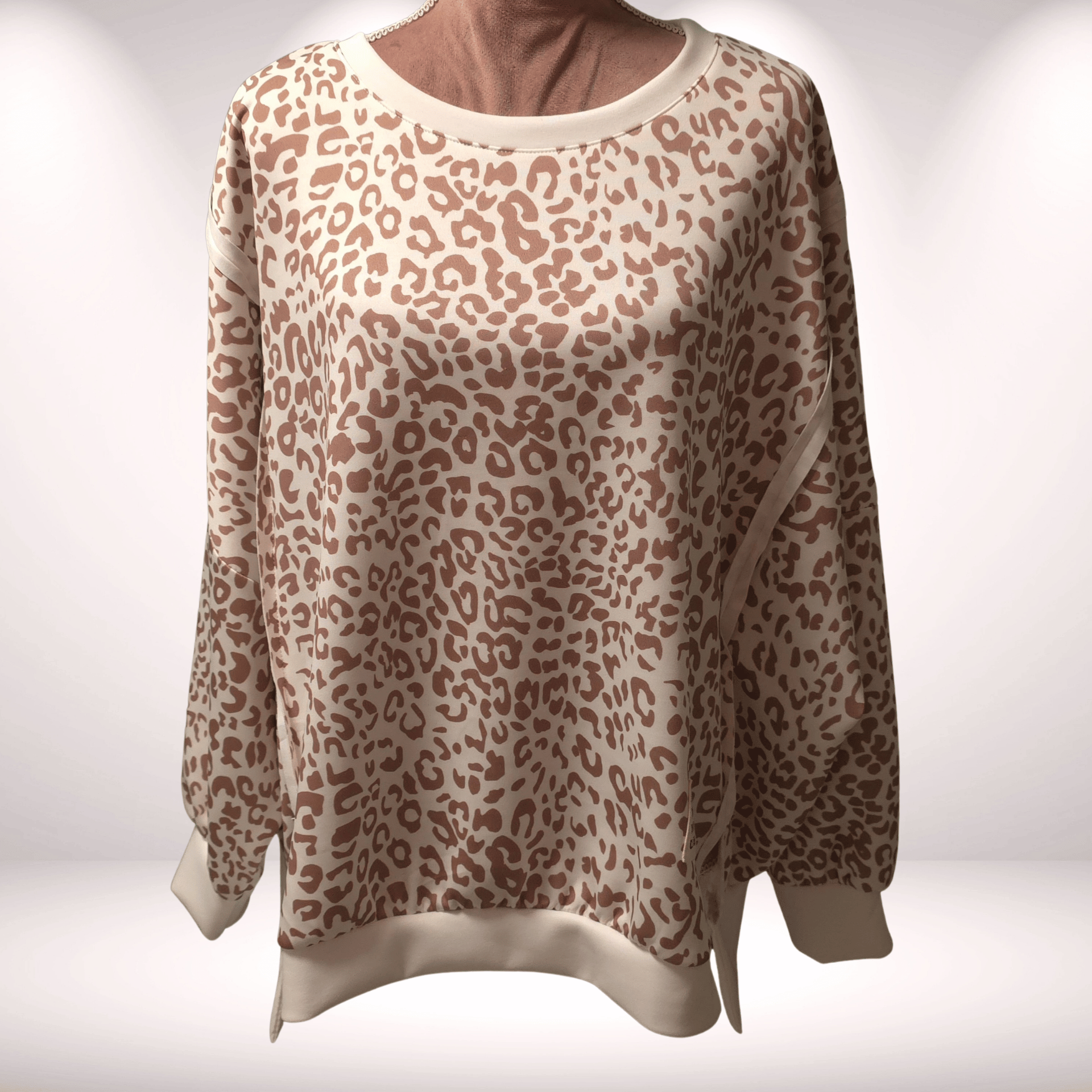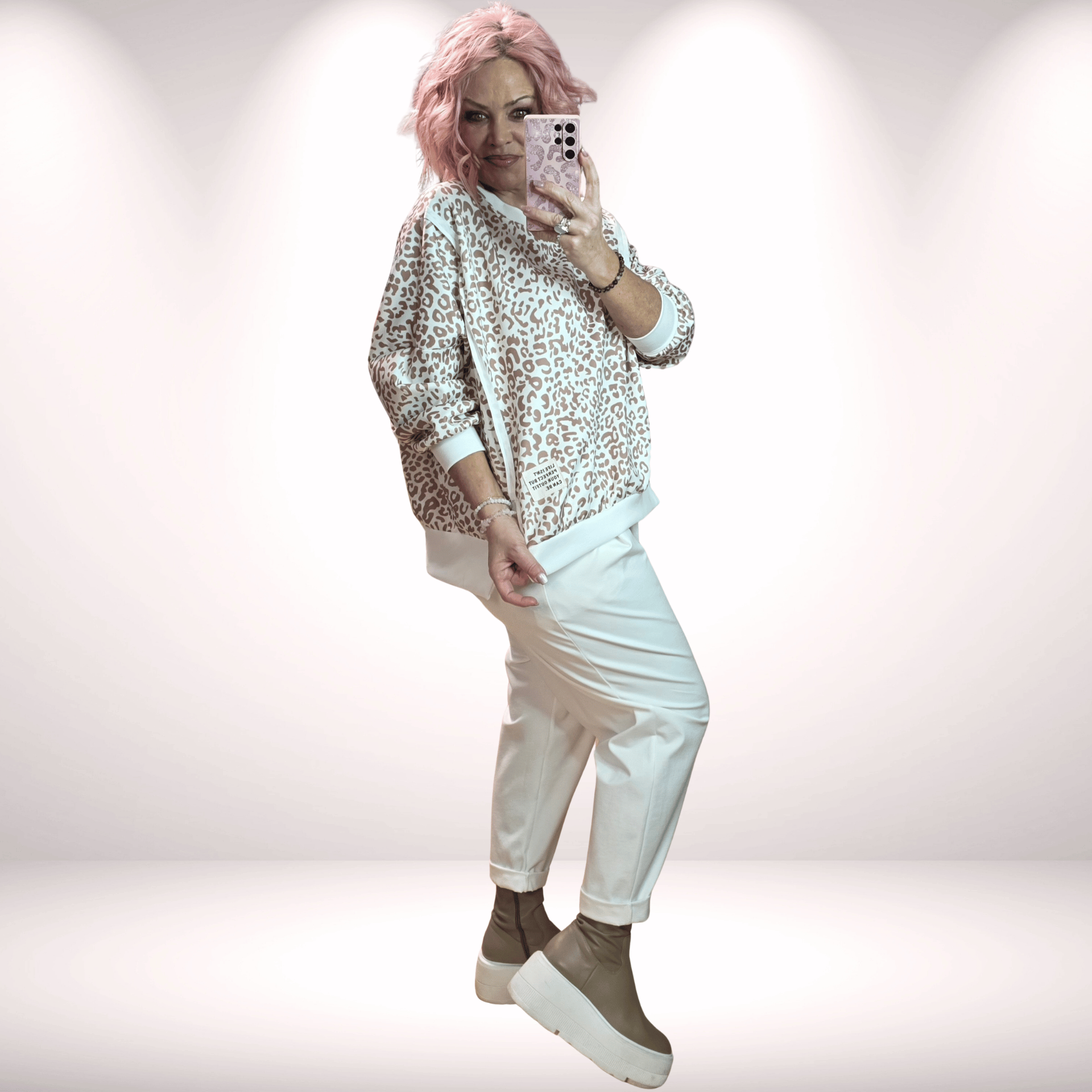 Dieser Leo Sweater in Offwhite mit Cortado-Leomuster ist ein echtes Fashion-Statement. Der groĂe Rundhalsausschnitt und der leichte Vokuhila-Schnitt sorgen fĂŒr einen lĂ€ssigen, modernen Look. Besonders schön: die Ărmelenden mit weiĂem Saum, die dem Sweater eine edle Note verleihen. Perfekt fĂŒr stylische Alltags-Outfits mit WohlfĂŒhlfaktor. âš