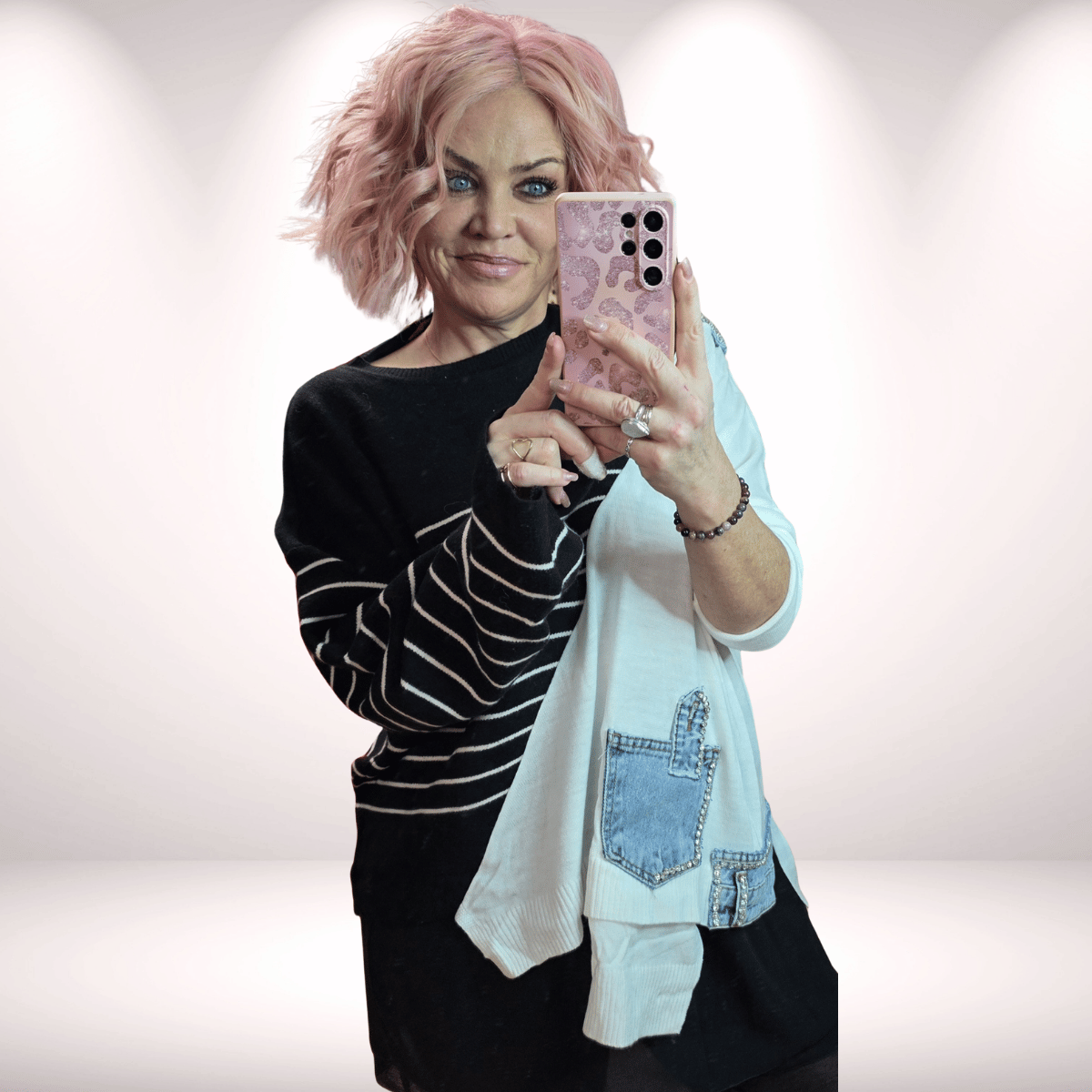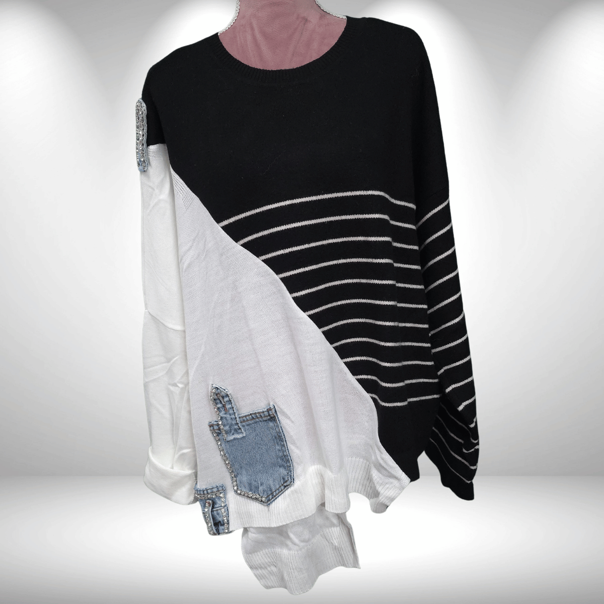 Dieser Trend Pulli in Black & White ist eine echte Limited Edition und ein absolutes Fashion-Statement. Die asymmetrische Länge sorgt für einen modernen Look, während Jeans-Patches und große Glitzerstein-Highlights dem Pullover einen einzigartigen Glam-Touch verleihen. Lässig, extravagant und perfekt für alle, die das Besondere lieben. ✨