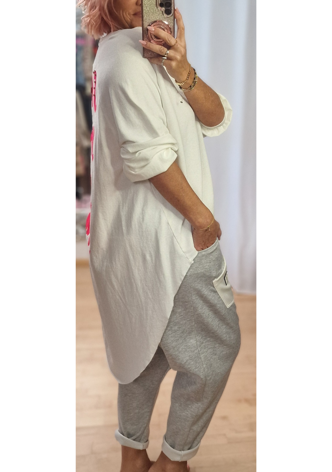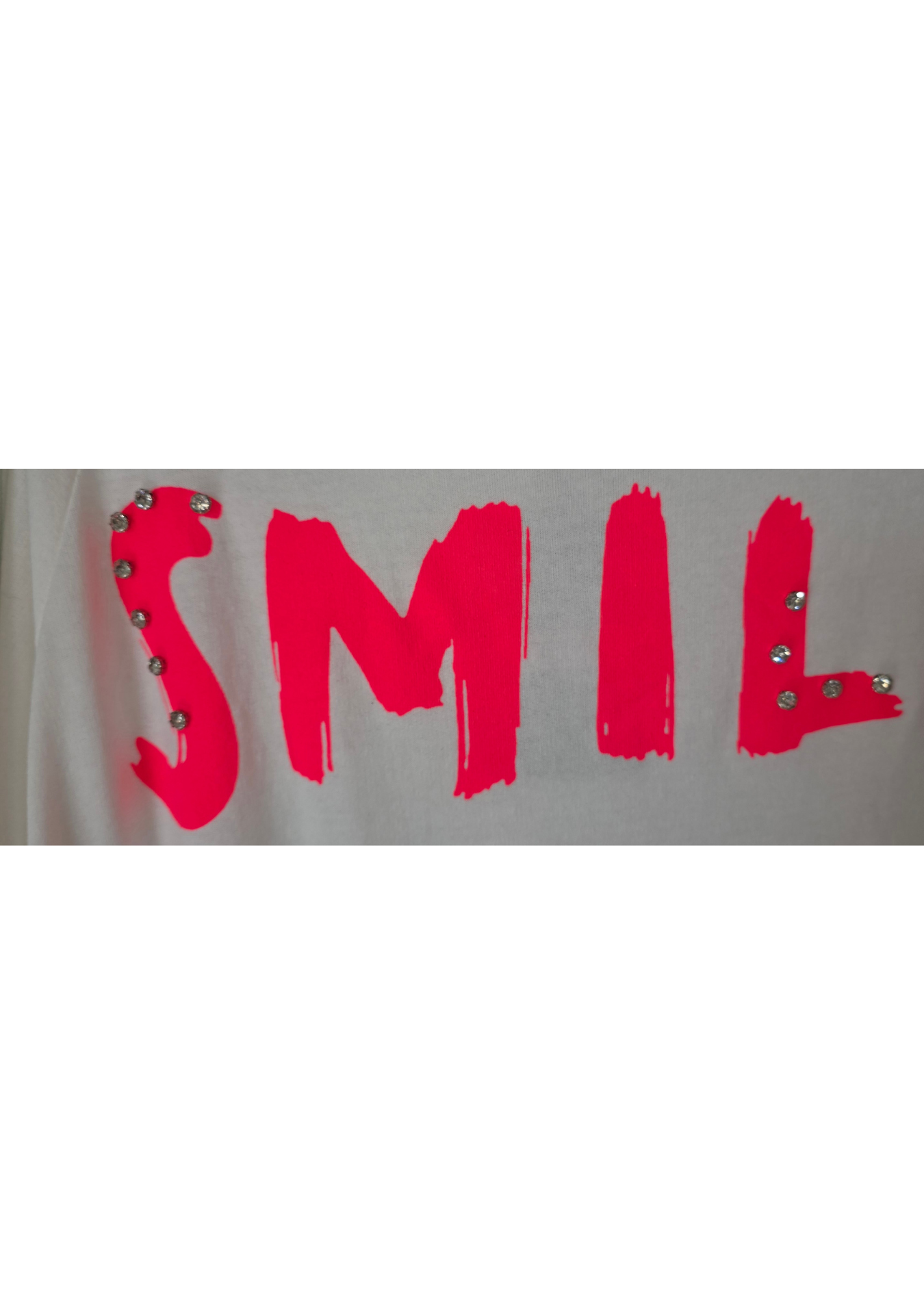Ein echter Hingucker – dieses coole Vokuhila-Shirt in strahlendem Weiß bringt mit seinem Neonpink-Smile-Print sofort gute Laune! Verziert mit funkelnden Strasssteinen auf dem Print, sorgt es für einen stylischen Glam-Effekt. Der lockere Schnitt mit längerem Rückenteil macht es nicht nur super bequem, sondern auch topmodern.