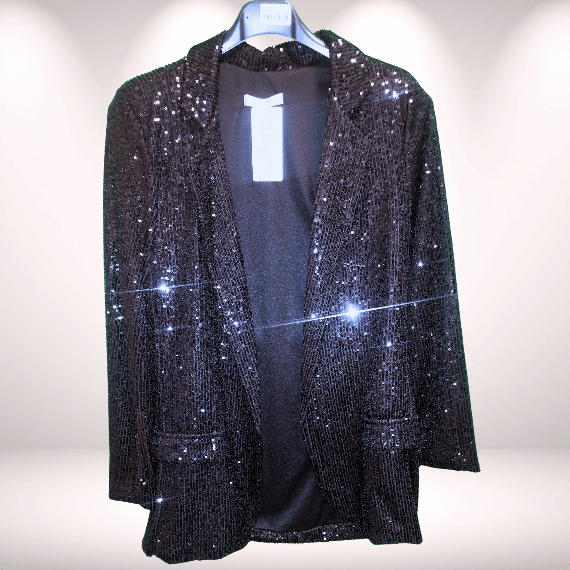 Dieser schwarze Pailletten-Blazer ist dein perfektes Special für Weihnachten, Silvester, Neujahrspartys oder jeden glamourösen Abend. Funkelnd, edel und trotzdem angenehm zu tragen – ein echtes Statement-Piece für besondere Momente.